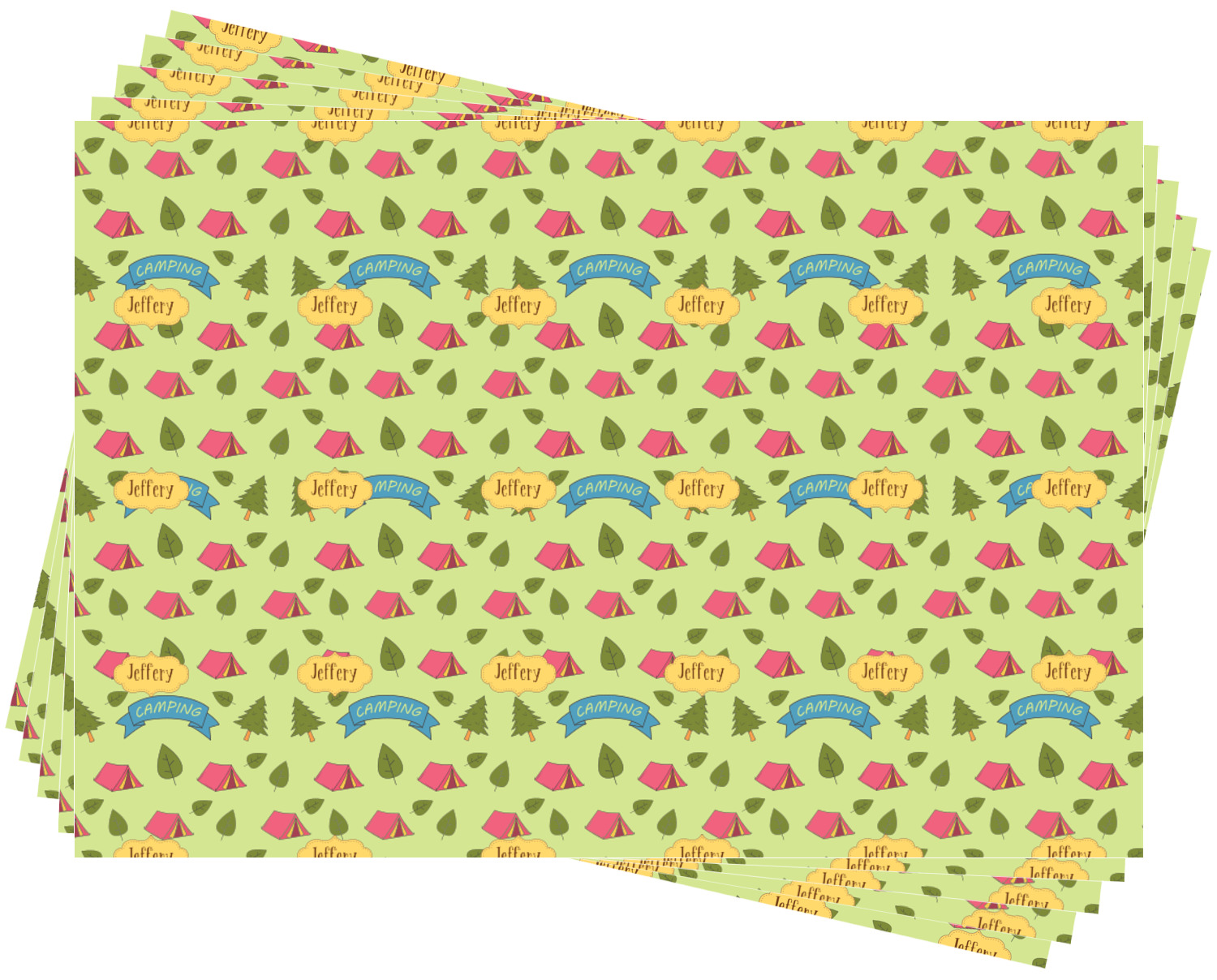 Your name or text fits on the space underneath the brown ribbon, on top of the green pattern. Both patterns have fun graphics that say the word "camping." Easily change the text to a saying or your own name. Take a peek at our camping graphics as well!