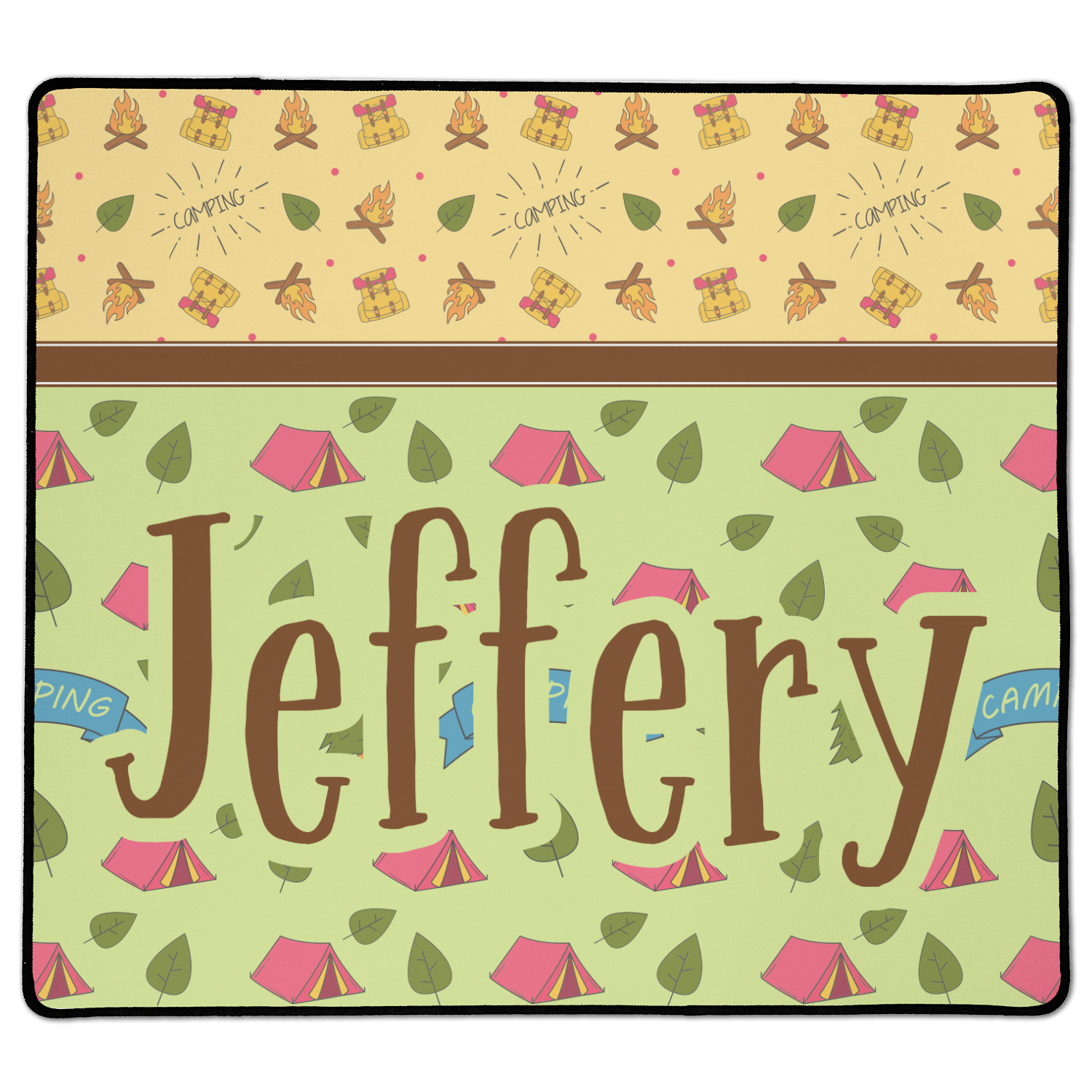 Your name or text fits on the space underneath the brown ribbon, on top of the green pattern. Both patterns have fun graphics that say the word "camping." Easily change the text to a saying or your own name. Take a peek at our camping graphics as well!