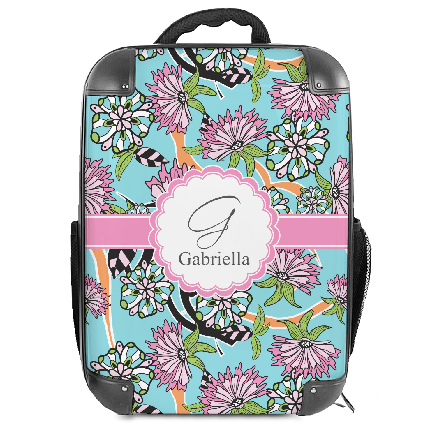 The flowers in this design are colored in two different shades of pink, lime green, and sky blue and are trimmed in black to make them pop out up against a sky blue background. The design has a classic ribbon in light pink trimmed in white. The decorative scalloped label is in white and trimmed in the light pink and white. Add an initial and a name for that personal touch to pull the entire design together.