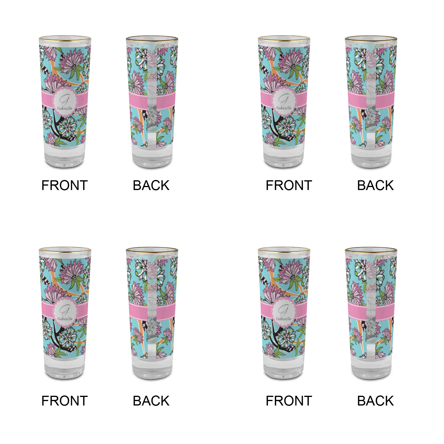 These glass shooter glasses are printed in full color with the design of your choice. These are a tall shooter 2 oz size and stand 4" tall. The print is a full wrap design to boldly display your personalization.