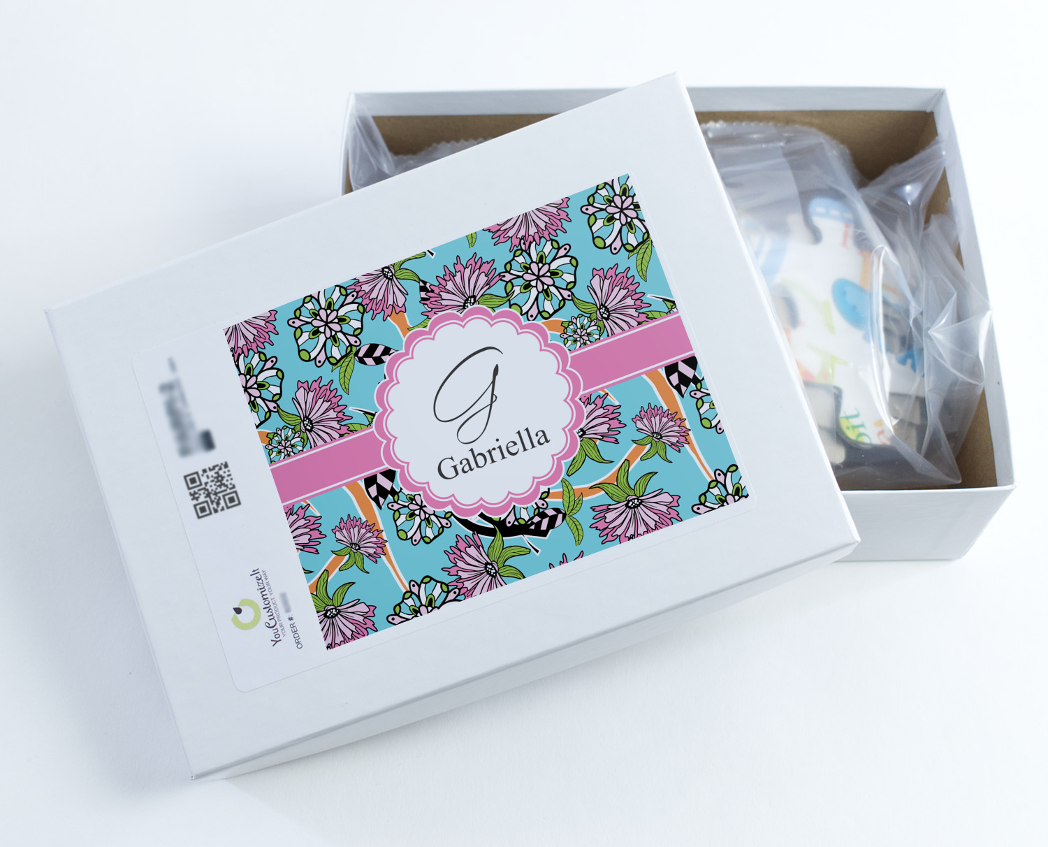 The flowers in this design are colored in two different shades of pink, lime green, and sky blue and are trimmed in black to make them pop out up against a sky blue background. The design has a classic ribbon in light pink trimmed in white. The decorative scalloped label is in white and trimmed in the light pink and white. Add an initial and a name for that personal touch to pull the entire design together.