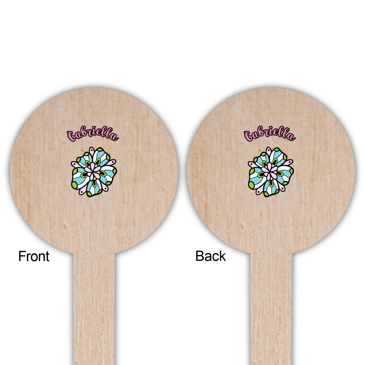 The flowers in this design are colored in two different shades of pink, lime green, and sky blue and are trimmed in black to make them pop out up against a sky blue background. The design has a classic ribbon in light pink trimmed in white. The decorative scalloped label is in white and trimmed in the light pink and white. Add an initial and a name for that personal touch to pull the entire design together.