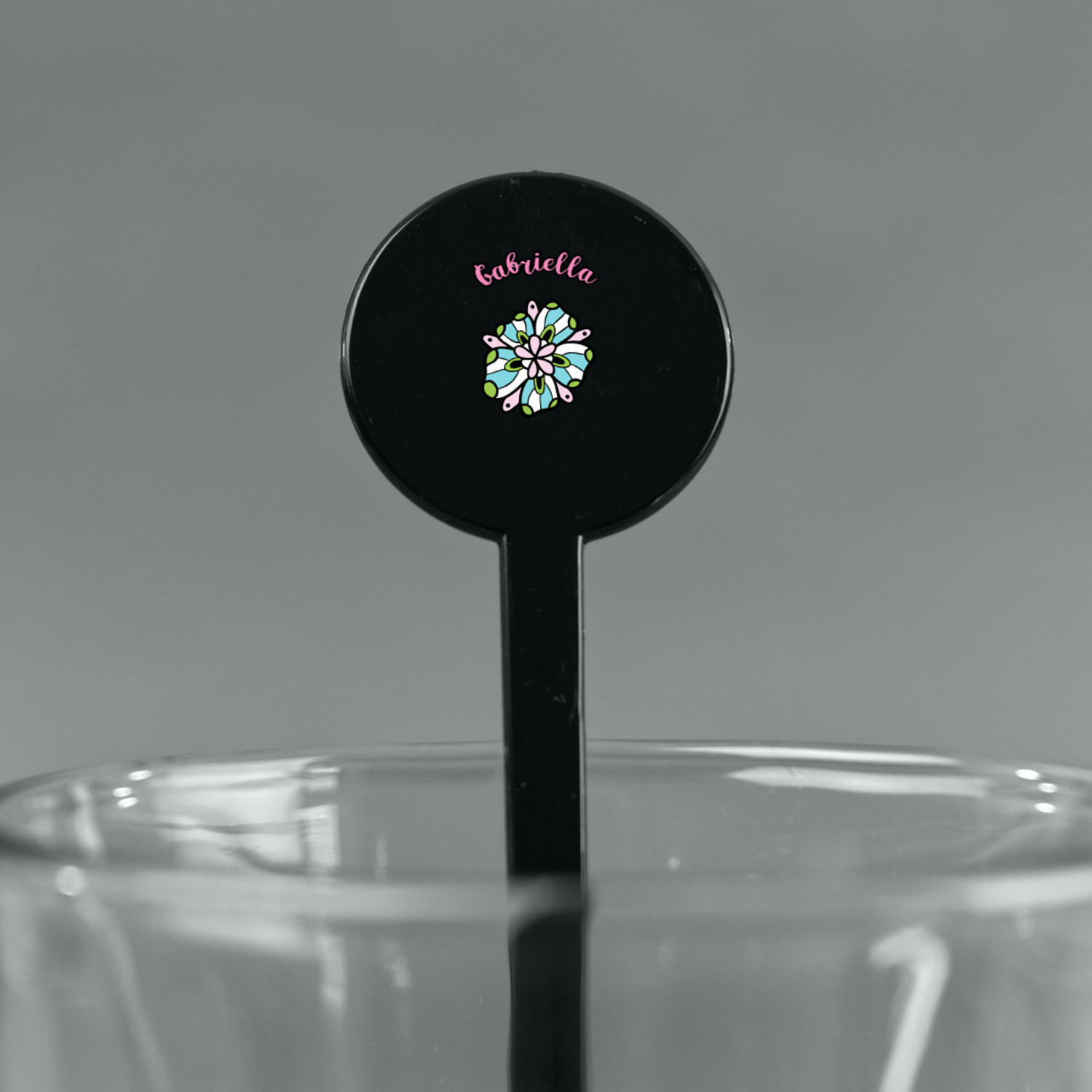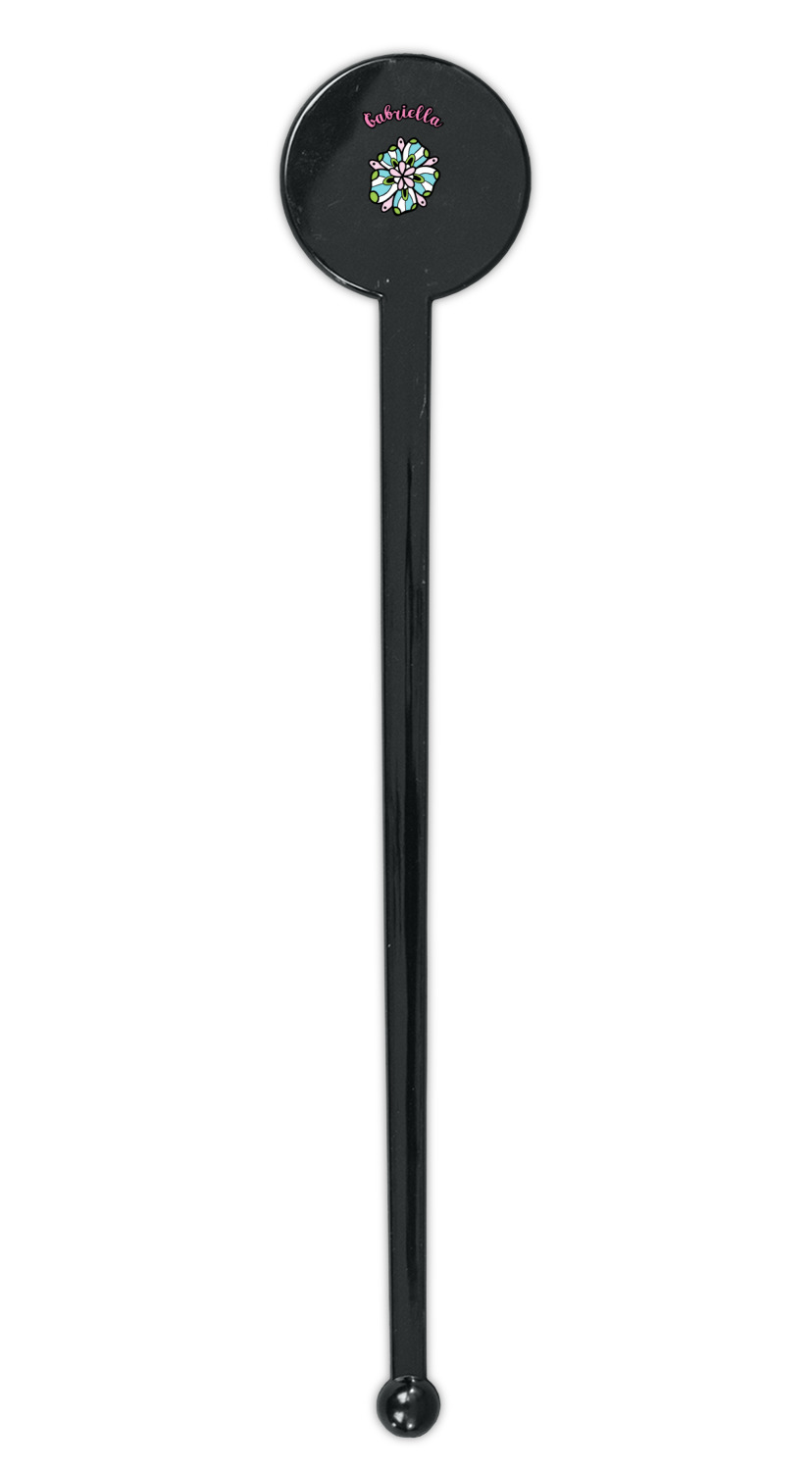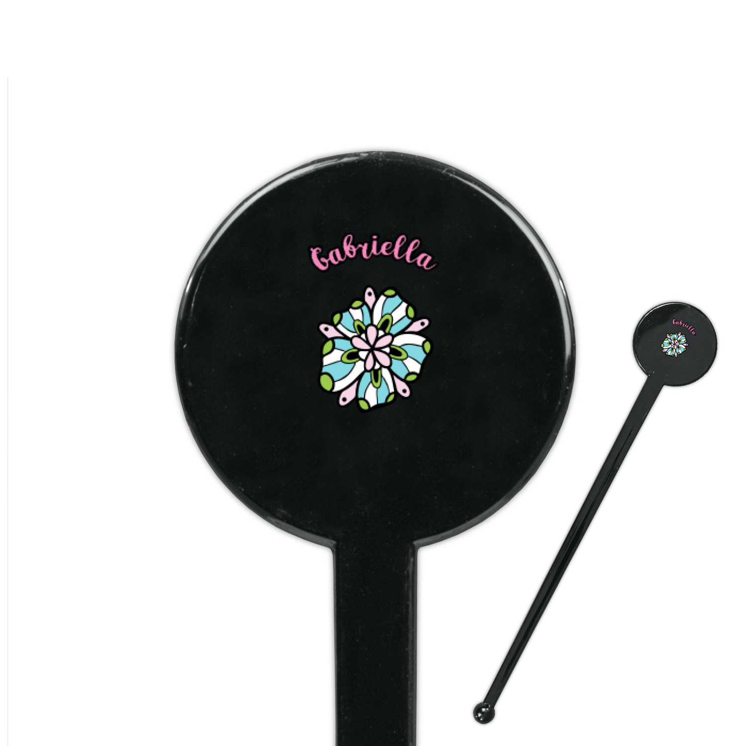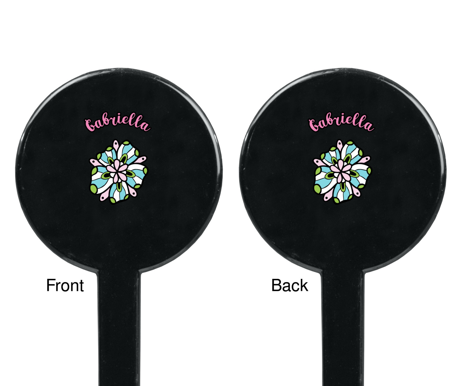 The flowers in this design are colored in two different shades of pink, lime green, and sky blue and are trimmed in black to make them pop out up against a sky blue background. The design has a classic ribbon in light pink trimmed in white. The decorative scalloped label is in white and trimmed in the light pink and white. Add an initial and a name for that personal touch to pull the entire design together.
