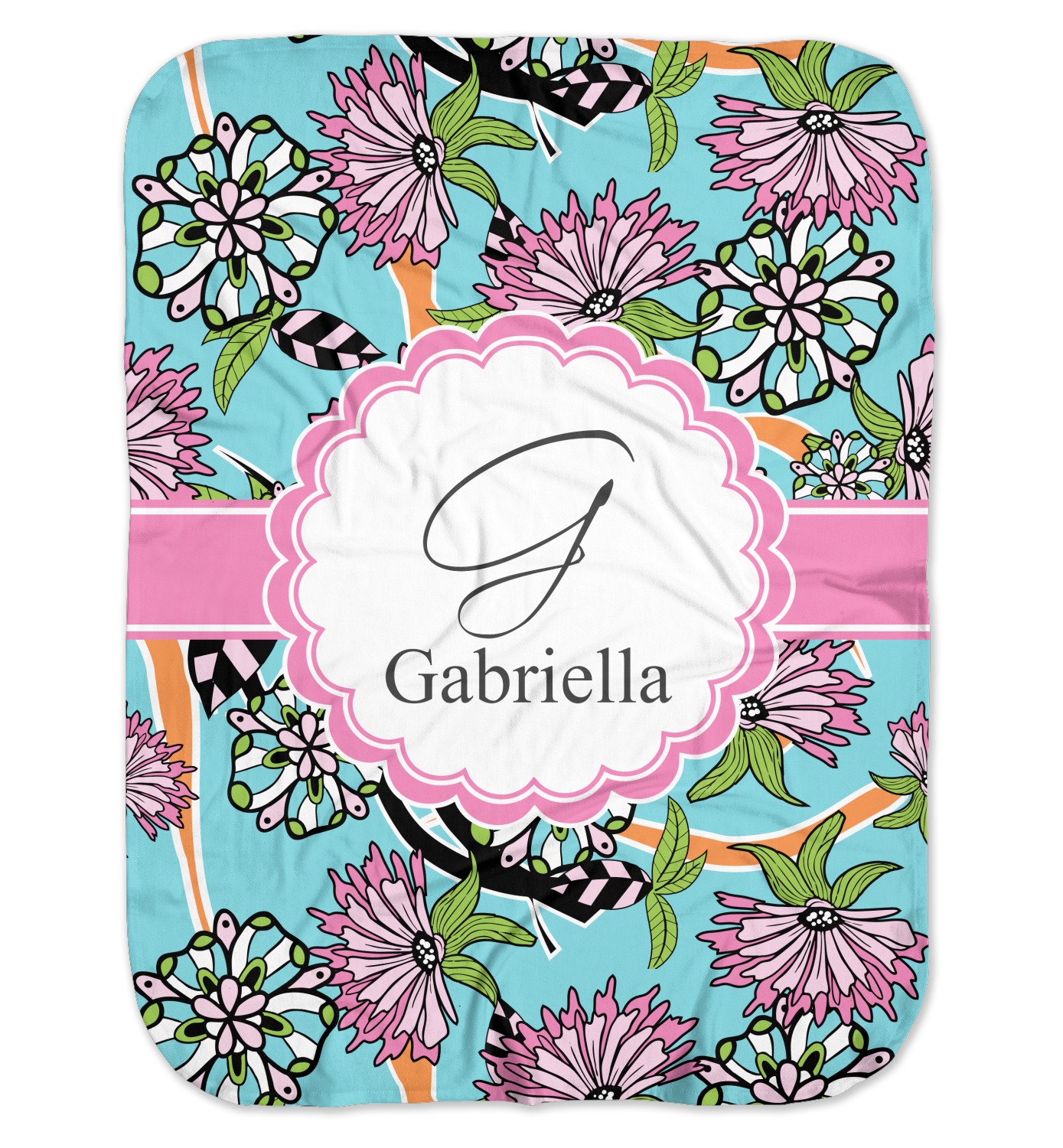 The flowers in this design are colored in two different shades of pink, lime green, and sky blue and are trimmed in black to make them pop out up against a sky blue background. The design has a classic ribbon in light pink trimmed in white. The decorative scalloped label is in white and trimmed in the light pink and white. Add an initial and a name for that personal touch to pull the entire design together.