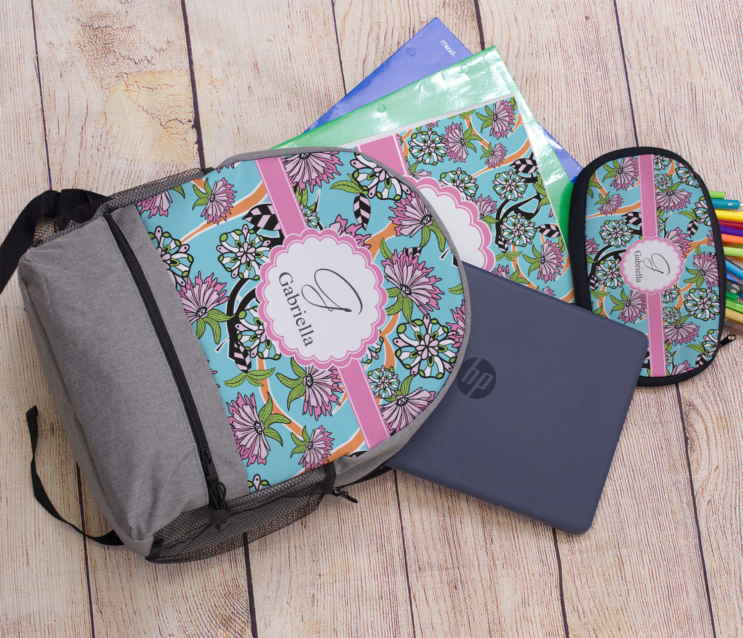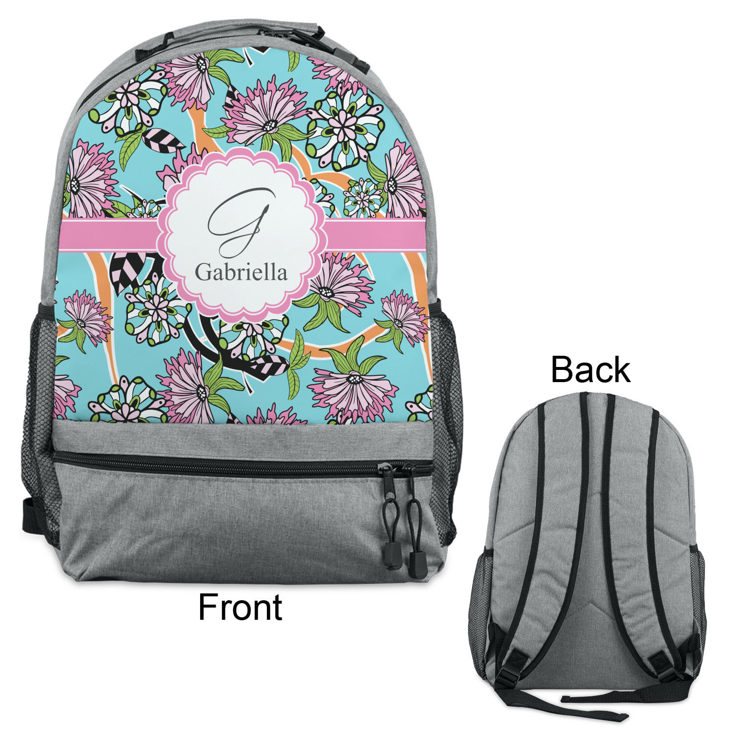 The flowers in this design are colored in two different shades of pink, lime green, and sky blue and are trimmed in black to make them pop out up against a sky blue background. The design has a classic ribbon in light pink trimmed in white. The decorative scalloped label is in white and trimmed in the light pink and white. Add an initial and a name for that personal touch to pull the entire design together.