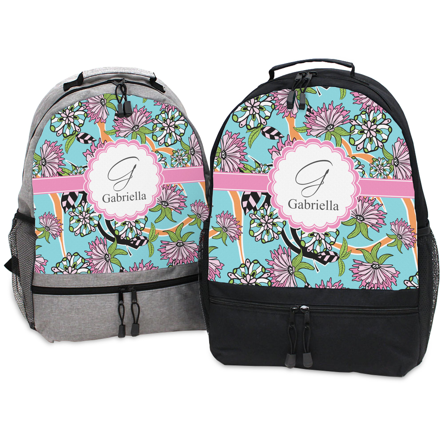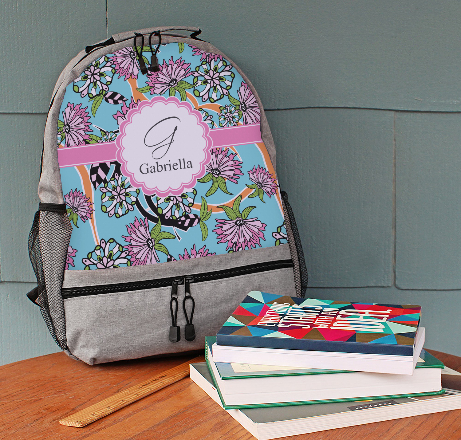 The flowers in this design are colored in two different shades of pink, lime green, and sky blue and are trimmed in black to make them pop out up against a sky blue background. The design has a classic ribbon in light pink trimmed in white. The decorative scalloped label is in white and trimmed in the light pink and white. Add an initial and a name for that personal touch to pull the entire design together.