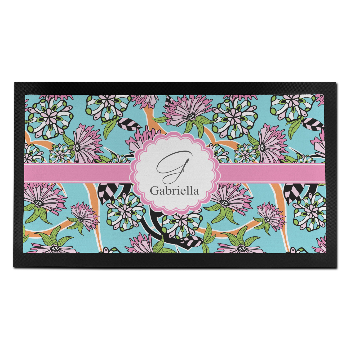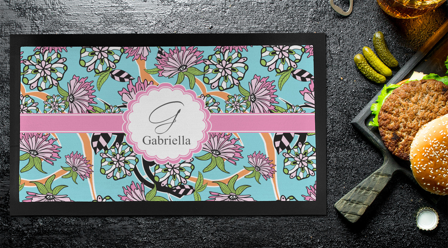 The flowers in this design are colored in two different shades of pink, lime green, and sky blue and are trimmed in black to make them pop out up against a sky blue background. The design has a classic ribbon in light pink trimmed in white. The decorative scalloped label is in white and trimmed in the light pink and white. Add an initial and a name for that personal touch to pull the entire design together.