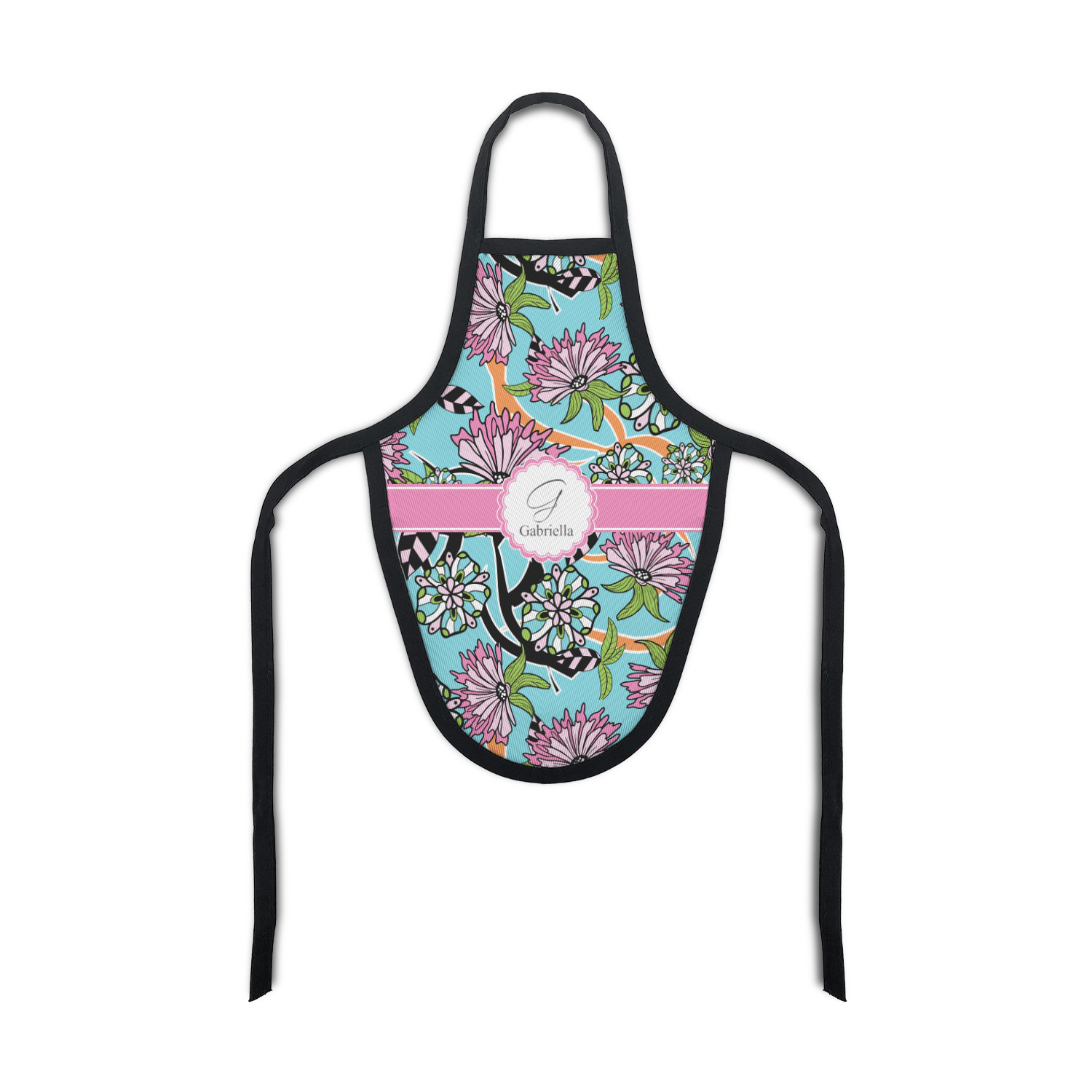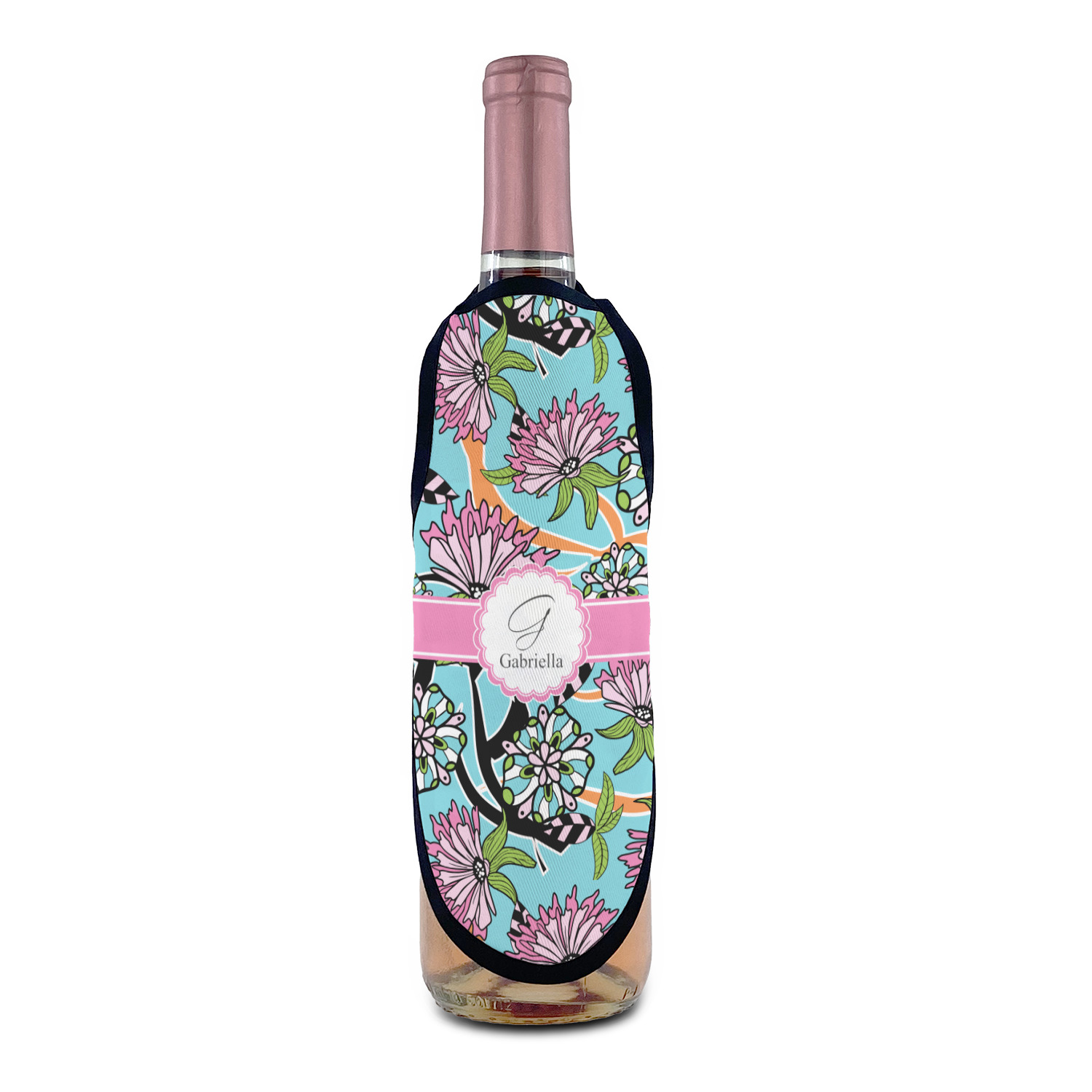The flowers in this design are colored in two different shades of pink, lime green, and sky blue and are trimmed in black to make them pop out up against a sky blue background. The design has a classic ribbon in light pink trimmed in white. The decorative scalloped label is in white and trimmed in the light pink and white. Add an initial and a name for that personal touch to pull the entire design together.