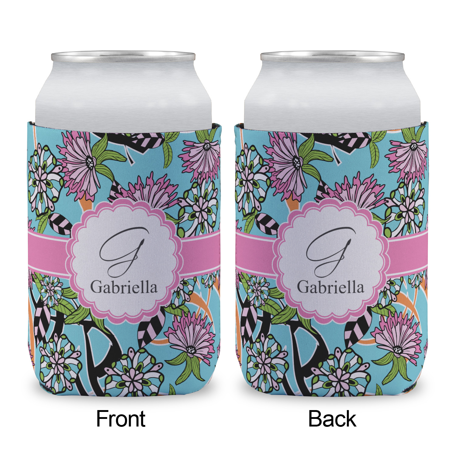 The flowers in this design are colored in two different shades of pink, lime green, and sky blue and are trimmed in black to make them pop out up against a sky blue background. The design has a classic ribbon in light pink trimmed in white. The decorative scalloped label is in white and trimmed in the light pink and white. Add an initial and a name for that personal touch to pull the entire design together.