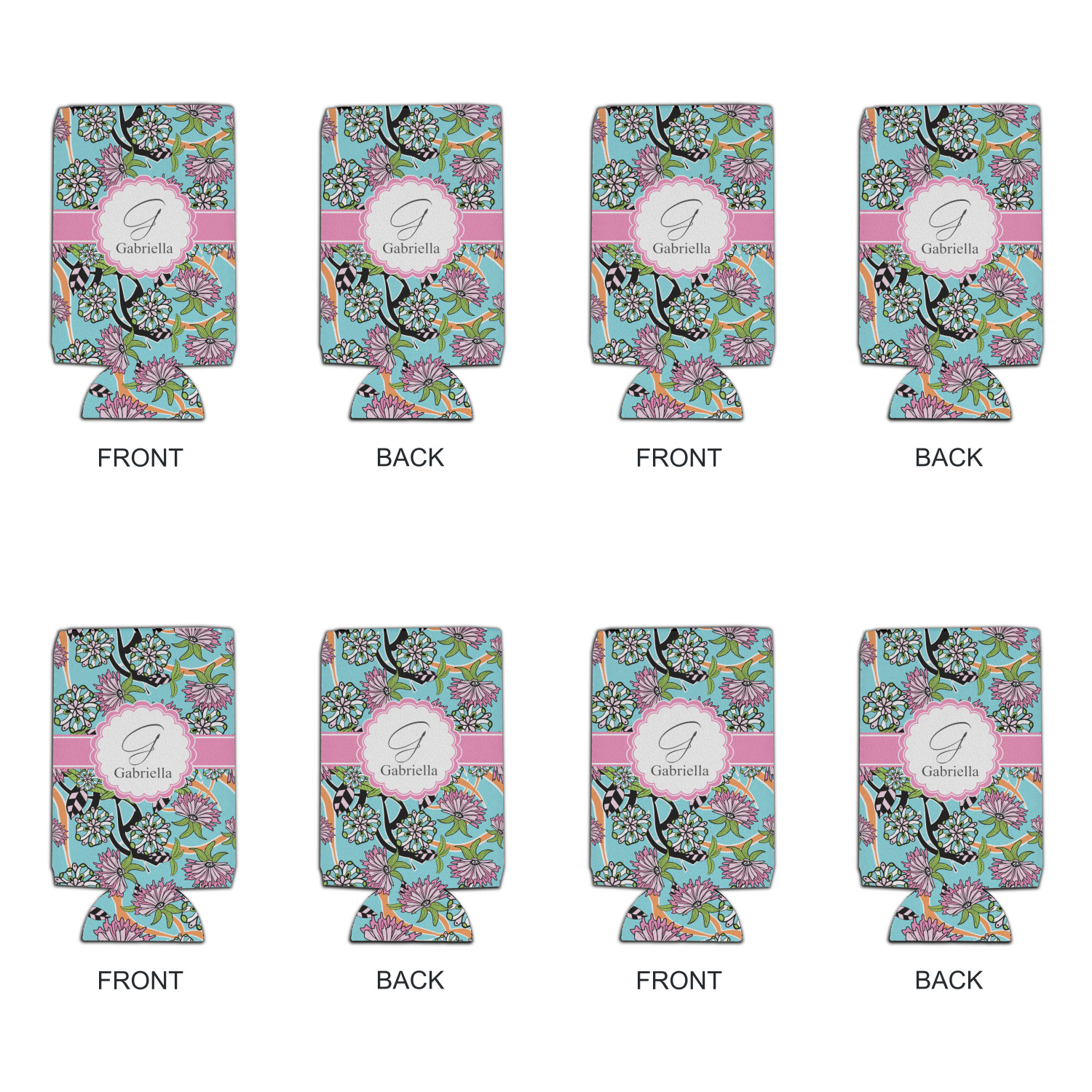 The flowers in this design are colored in two different shades of pink, lime green, and sky blue and are trimmed in black to make them pop out up against a sky blue background. The design has a classic ribbon in light pink trimmed in white. The decorative scalloped label is in white and trimmed in the light pink and white. Add an initial and a name for that personal touch to pull the entire design together.