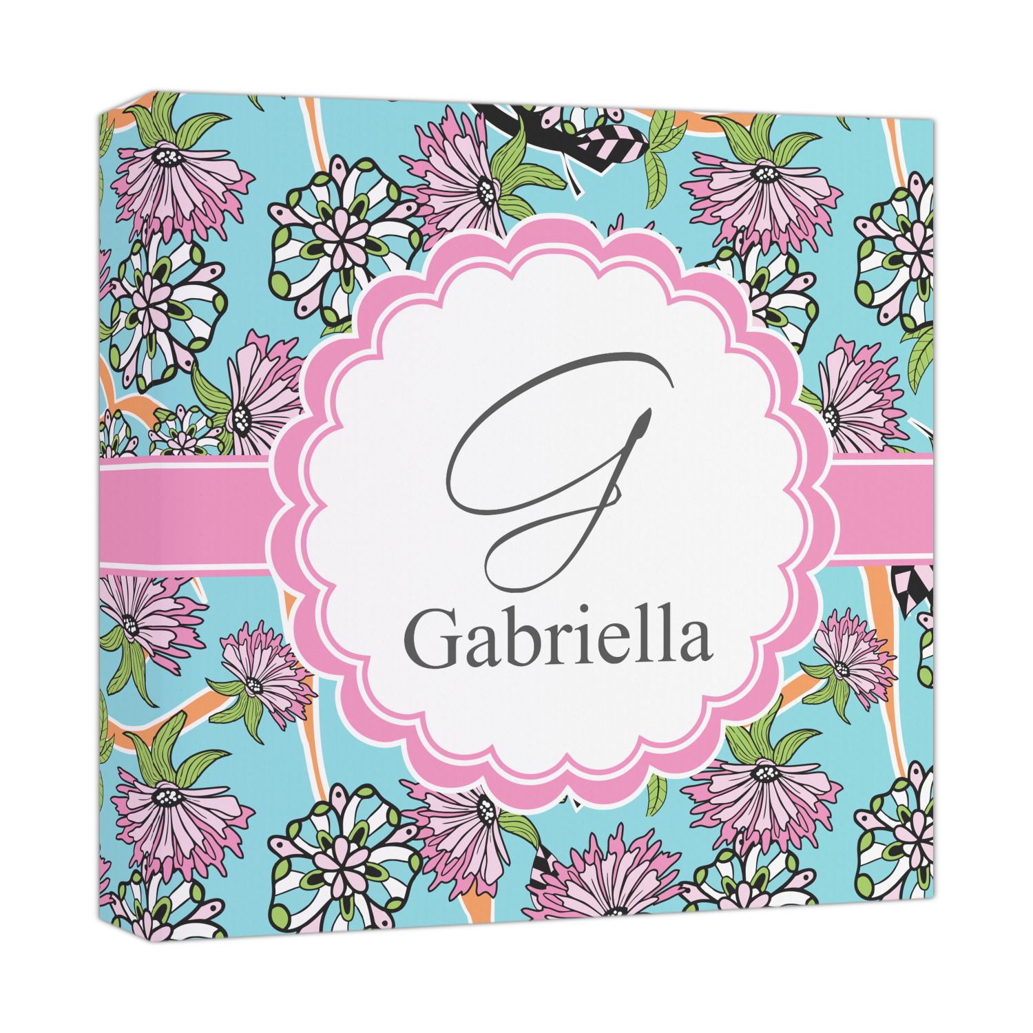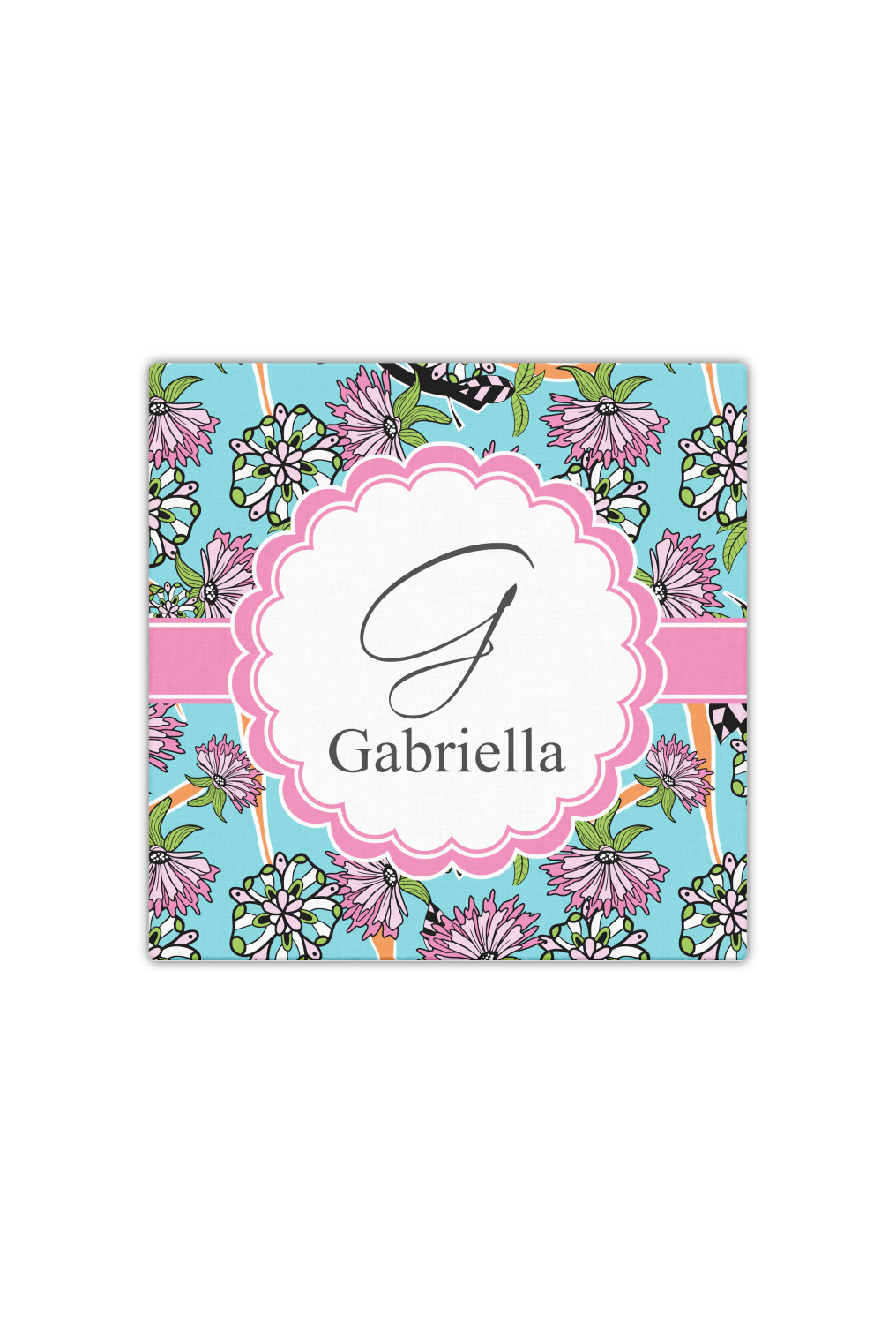 The flowers in this design are colored in two different shades of pink, lime green, and sky blue and are trimmed in black to make them pop out up against a sky blue background. The design has a classic ribbon in light pink trimmed in white. The decorative scalloped label is in white and trimmed in the light pink and white. Add an initial and a name for that personal touch to pull the entire design together.