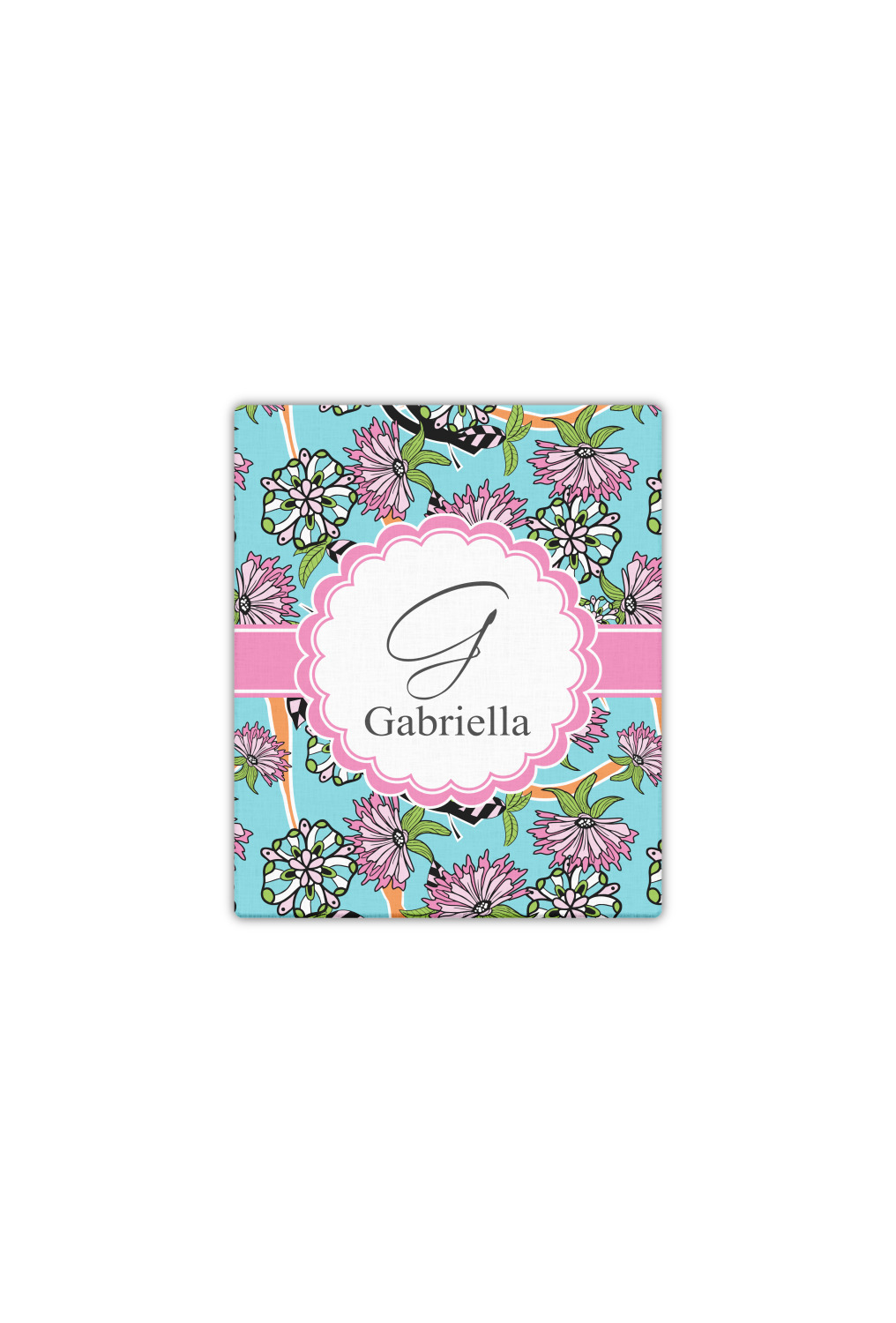 The flowers in this design are colored in two different shades of pink, lime green, and sky blue and are trimmed in black to make them pop out up against a sky blue background. The design has a classic ribbon in light pink trimmed in white. The decorative scalloped label is in white and trimmed in the light pink and white. Add an initial and a name for that personal touch to pull the entire design together.
