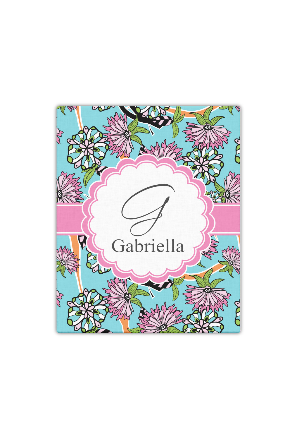 The flowers in this design are colored in two different shades of pink, lime green, and sky blue and are trimmed in black to make them pop out up against a sky blue background. The design has a classic ribbon in light pink trimmed in white. The decorative scalloped label is in white and trimmed in the light pink and white. Add an initial and a name for that personal touch to pull the entire design together.