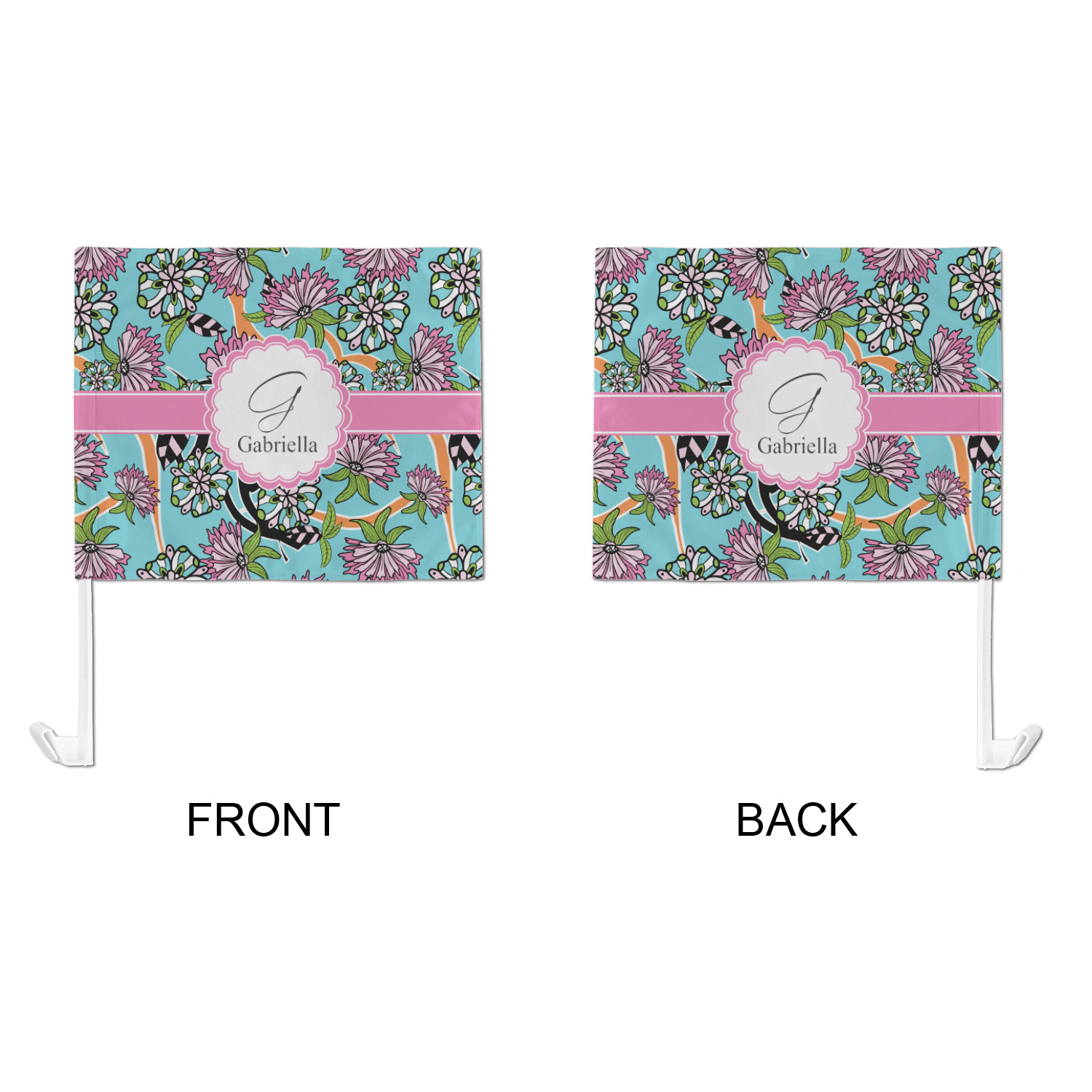 Our personalized flags are made from a durable, yet lightweight cloth that will proudly bear your logo or design of choice, while withstanding the outside elements. We have two size options - 8" x 11" and 11" x 15". Both come with a flag pole which includes a clip that secures the pole to the side window, whether it is rolled up or down. The flags are printed on both sides to display your design from all directions.