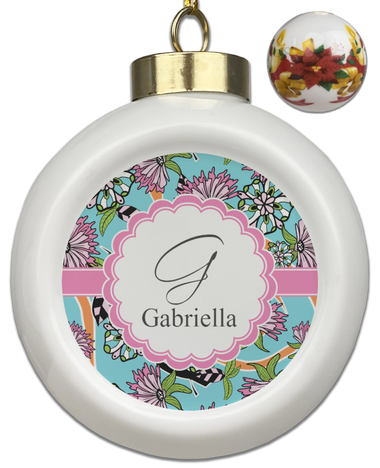 Our Christmas ornaments are a unique ceramic ball shape with a twist as it has a flat face to display your custom design! Select from one of our two design types - Christmas Tree or Poinsettia Garland - to adorn the curved back of your personal design. Each ornament measures 3H x 2.5W x 2D accompanied with a gold string accent for finishing touches to hang on your beautiful Christmas tree!