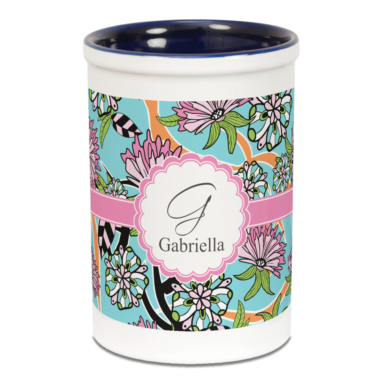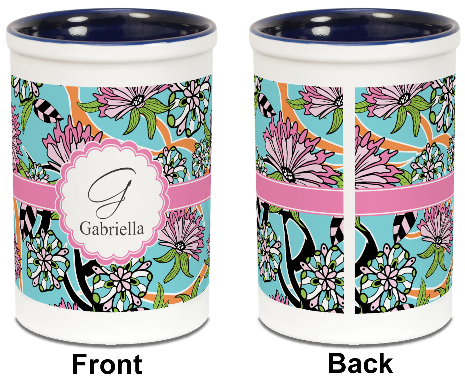 The flowers in this design are colored in two different shades of pink, lime green, and sky blue and are trimmed in black to make them pop out up against a sky blue background. The design has a classic ribbon in light pink trimmed in white. The decorative scalloped label is in white and trimmed in the light pink and white. Add an initial and a name for that personal touch to pull the entire design together.