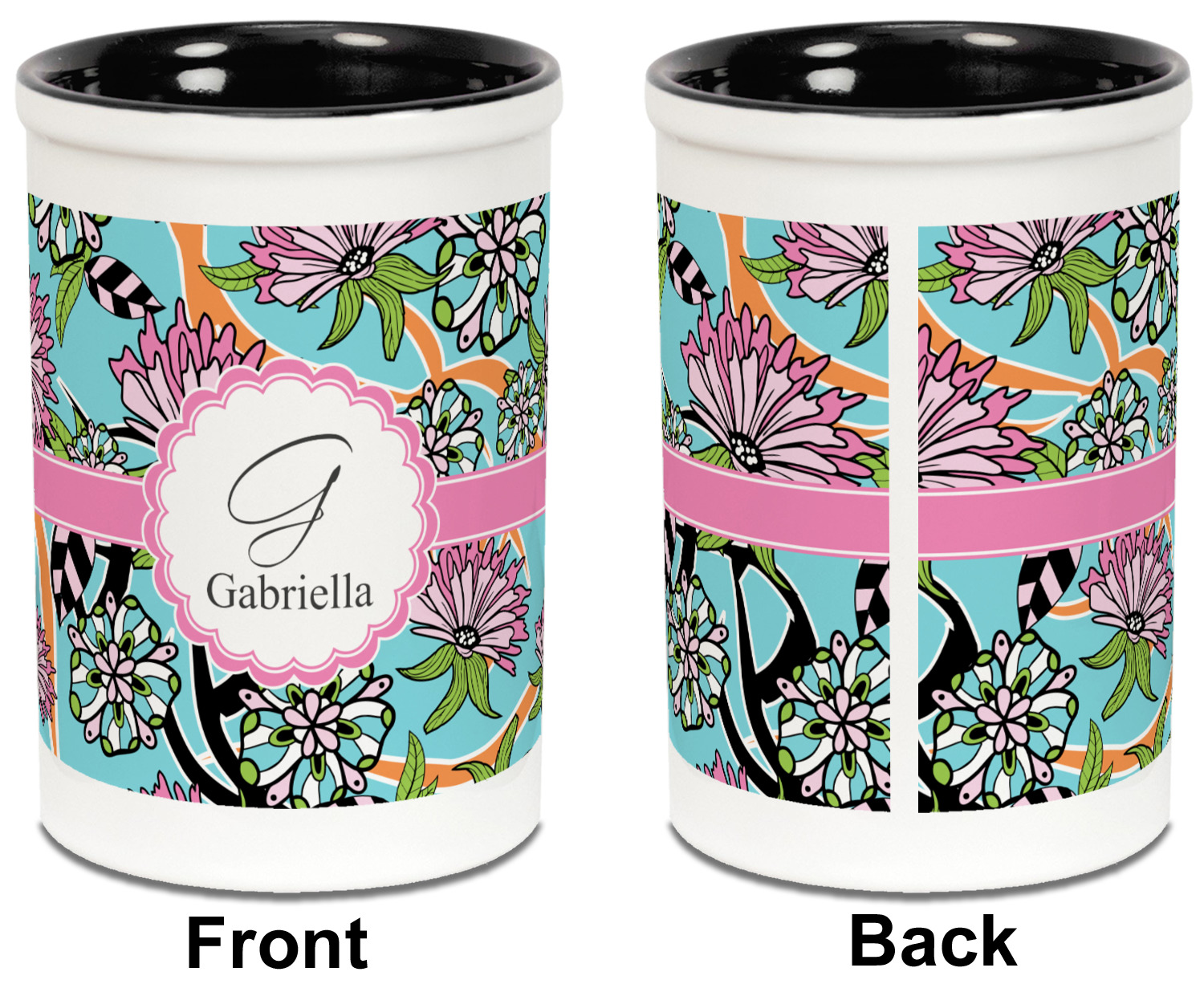 The flowers in this design are colored in two different shades of pink, lime green, and sky blue and are trimmed in black to make them pop out up against a sky blue background. The design has a classic ribbon in light pink trimmed in white. The decorative scalloped label is in white and trimmed in the light pink and white. Add an initial and a name for that personal touch to pull the entire design together.