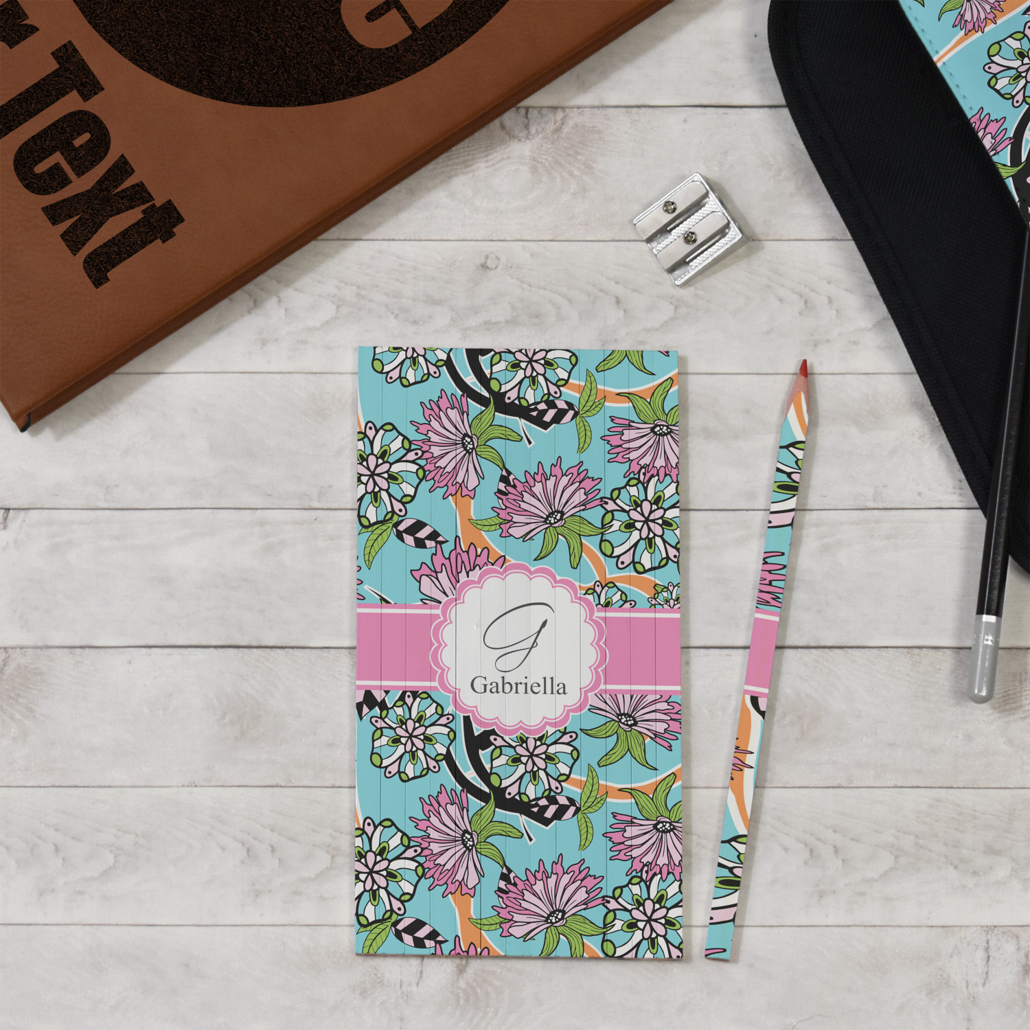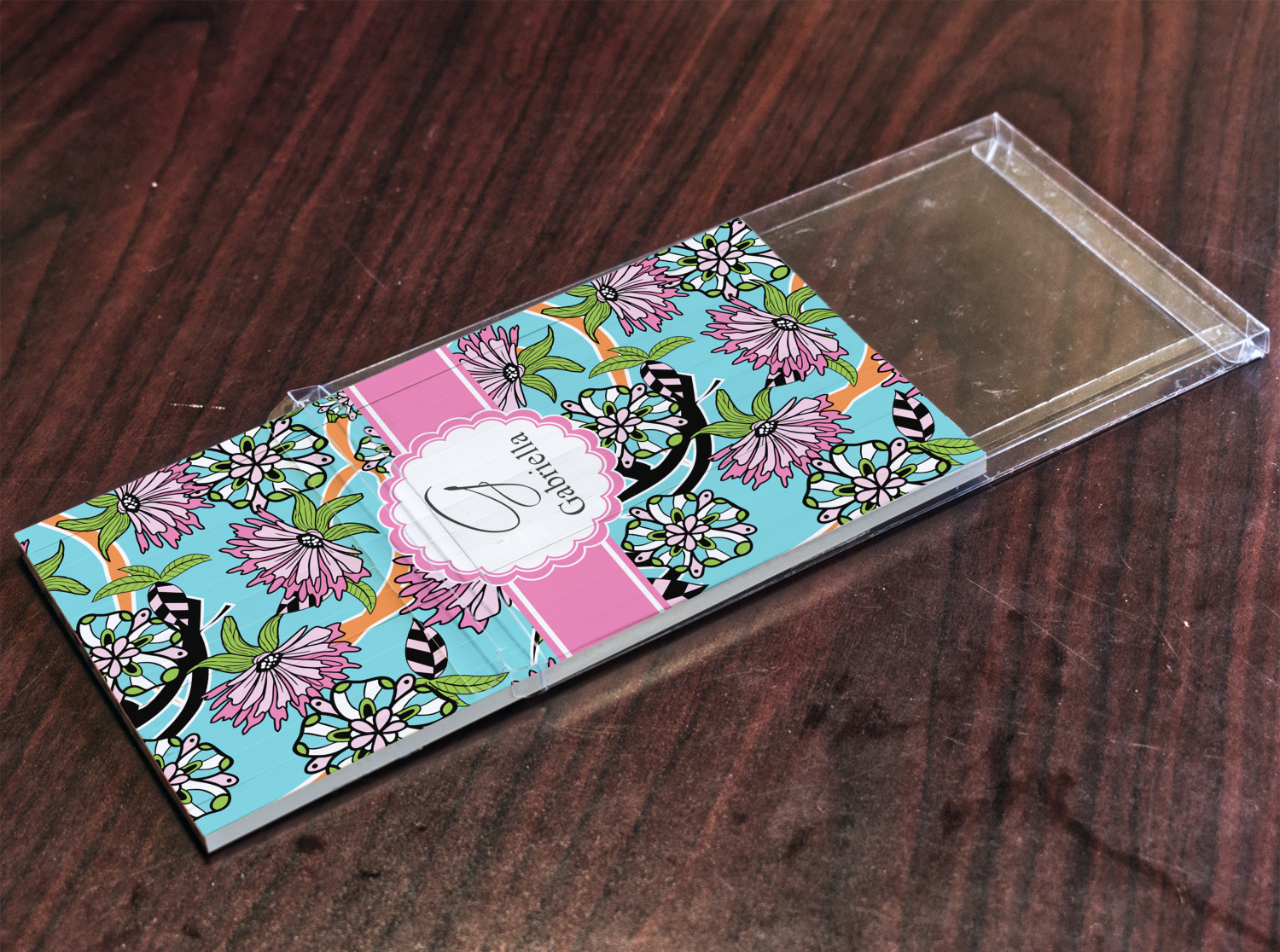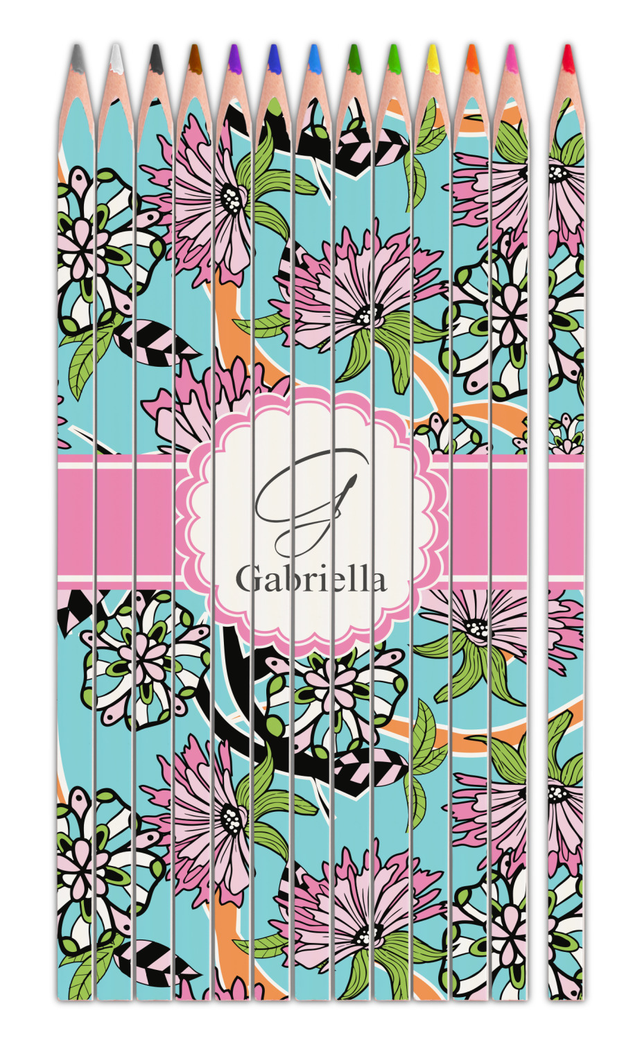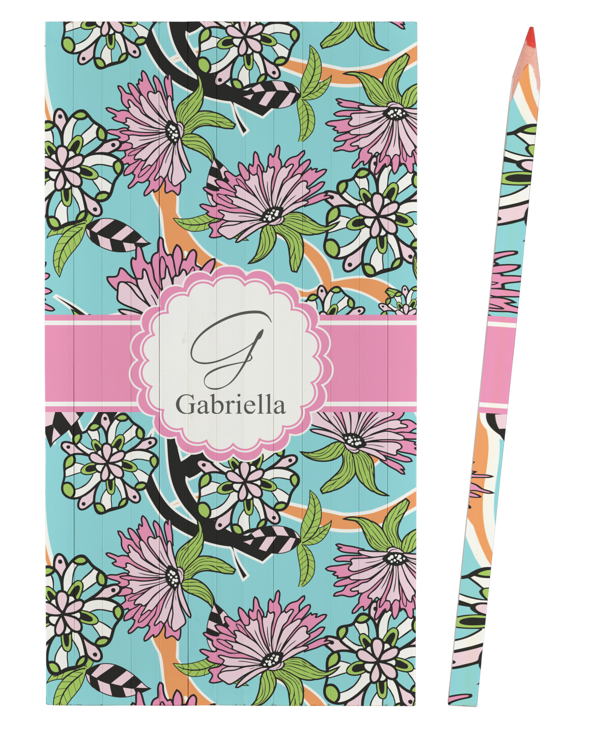 The flowers in this design are colored in two different shades of pink, lime green, and sky blue and are trimmed in black to make them pop out up against a sky blue background. The design has a classic ribbon in light pink trimmed in white. The decorative scalloped label is in white and trimmed in the light pink and white. Add an initial and a name for that personal touch to pull the entire design together.