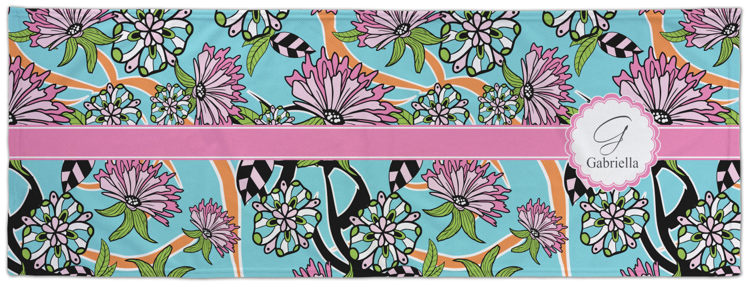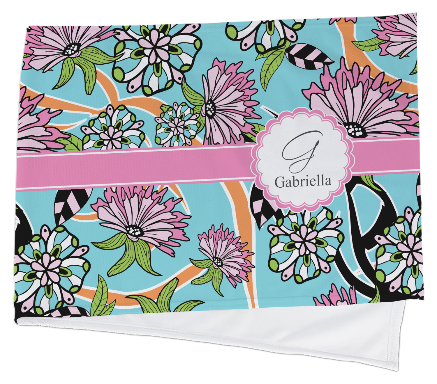 The flowers in this design are colored in two different shades of pink, lime green, and sky blue and are trimmed in black to make them pop out up against a sky blue background. The design has a classic ribbon in light pink trimmed in white. The decorative scalloped label is in white and trimmed in the light pink and white. Add an initial and a name for that personal touch to pull the entire design together.