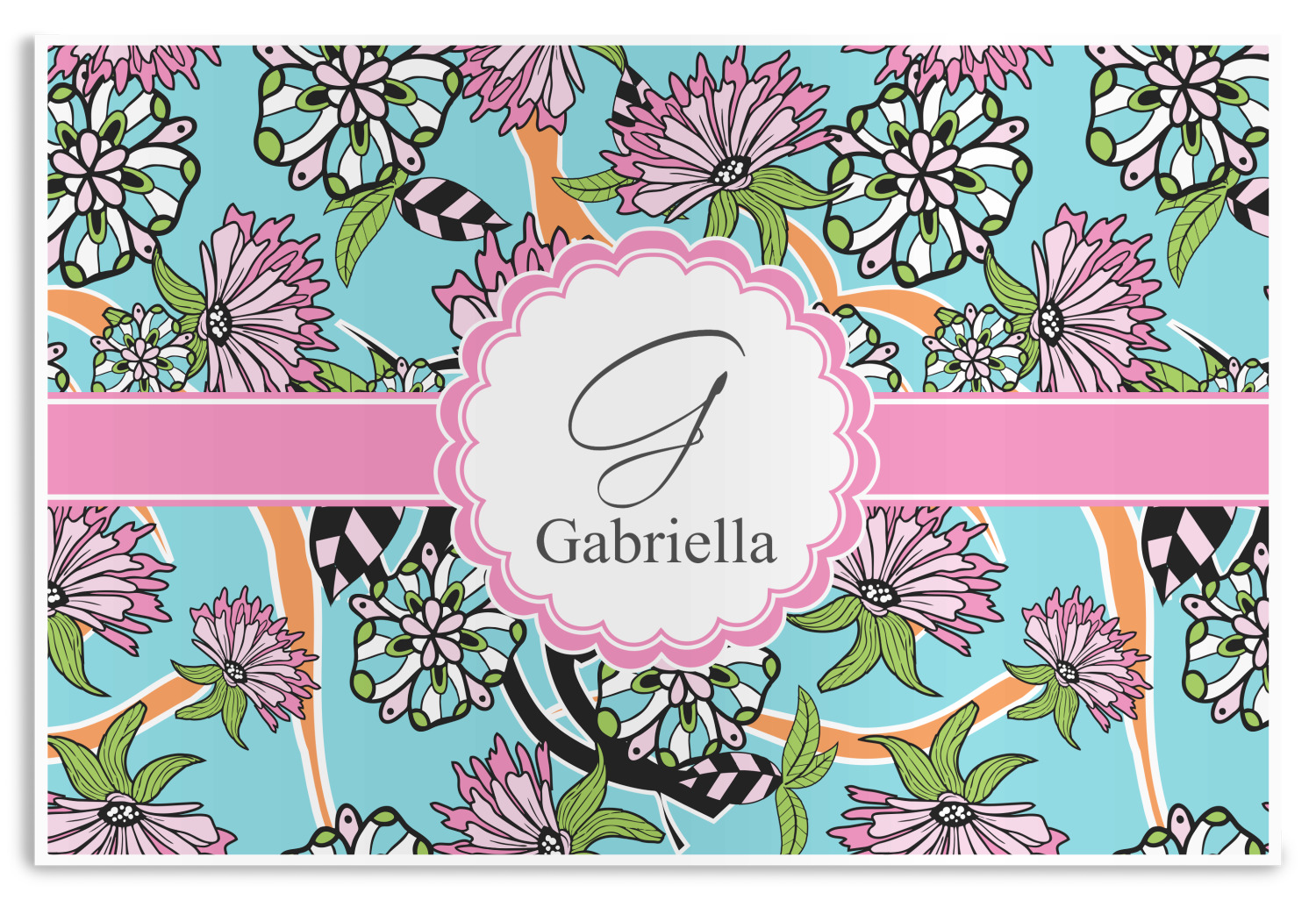 The flowers in this design are colored in two different shades of pink, lime green, and sky blue and are trimmed in black to make them pop out up against a sky blue background. The design has a classic ribbon in light pink trimmed in white. The decorative scalloped label is in white and trimmed in the light pink and white. Add an initial and a name for that personal touch to pull the entire design together.