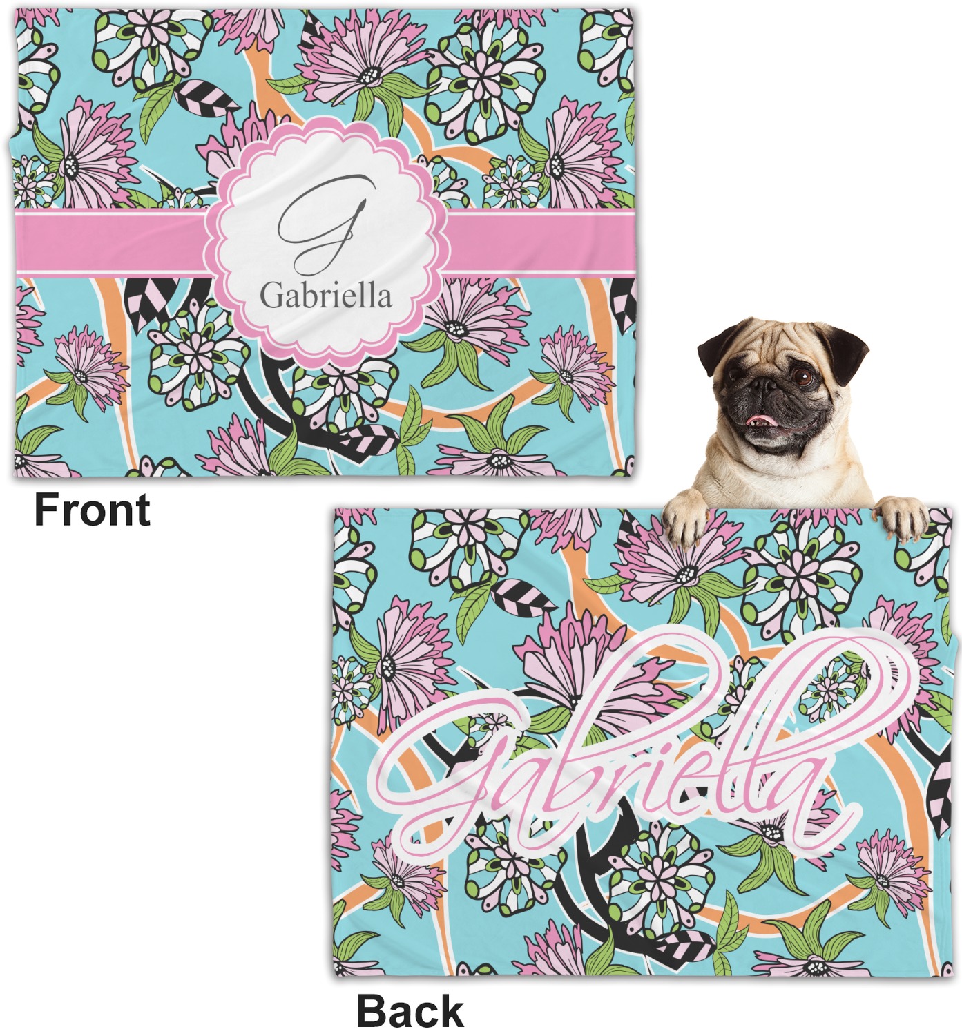 These dog blankets are crafted from a gentle, soft-to-the-touch, minky material. We print your customizations, either matching or differing, on both the top and underside of the blanket. These personalized dog blankets are available in two sizes: regular and large. Our regular size, at 40" x 30", accommodates small and some medium size dogs. At 60" x 50", our large dog blanket is a better fit for bigger breeds. Though specialized for dogs, these blankets still make a thoughtful gift for your favorite feline, or any other pet in mind!