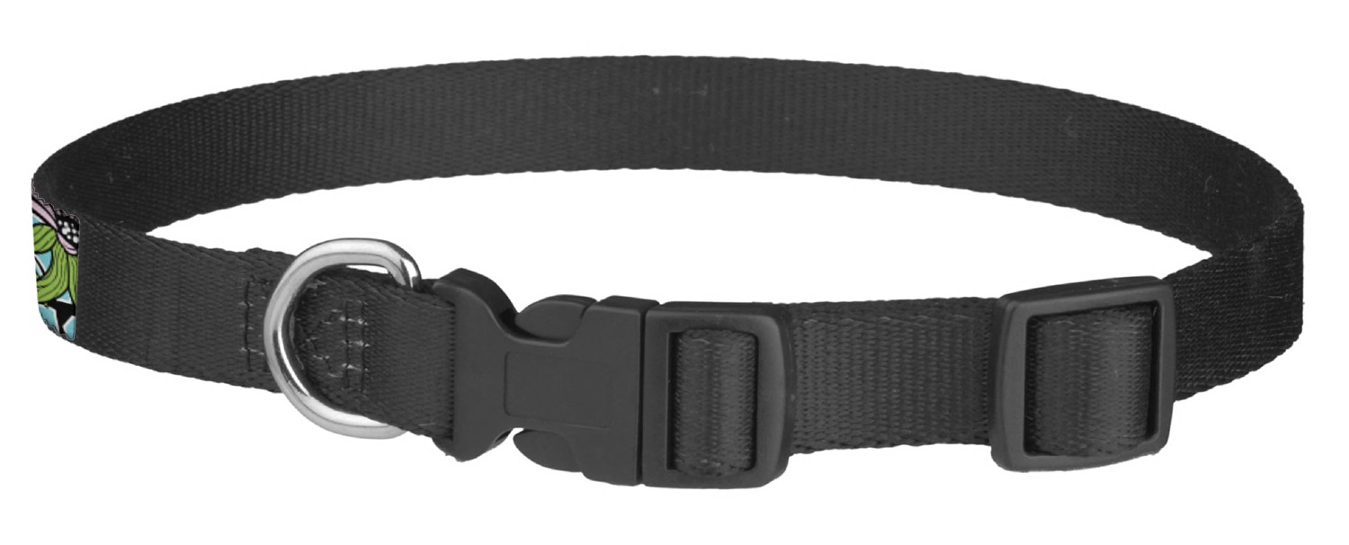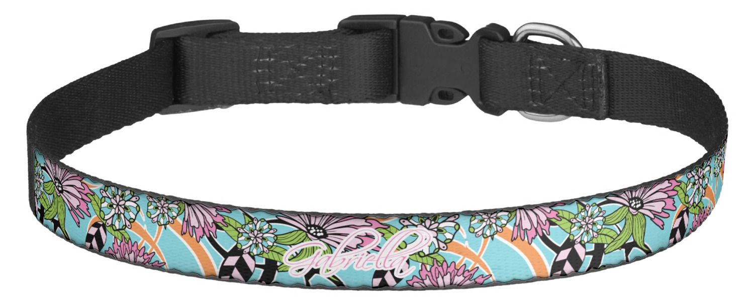 This sturdy collar, made from a durable nylon weave, will outlive your dog's episodes of excited tugging and pulling. Courtesy of its thick plastic buckle and adjuster, this collar is adjustable and accommodating of any dog. Structurally, the collar is a single piece of nylon weave that is sewn together, and features a solid metal loop where you can attach a leash or dog tag. We print and display your dog's name and pattern across the middle of the personalized dog collar.