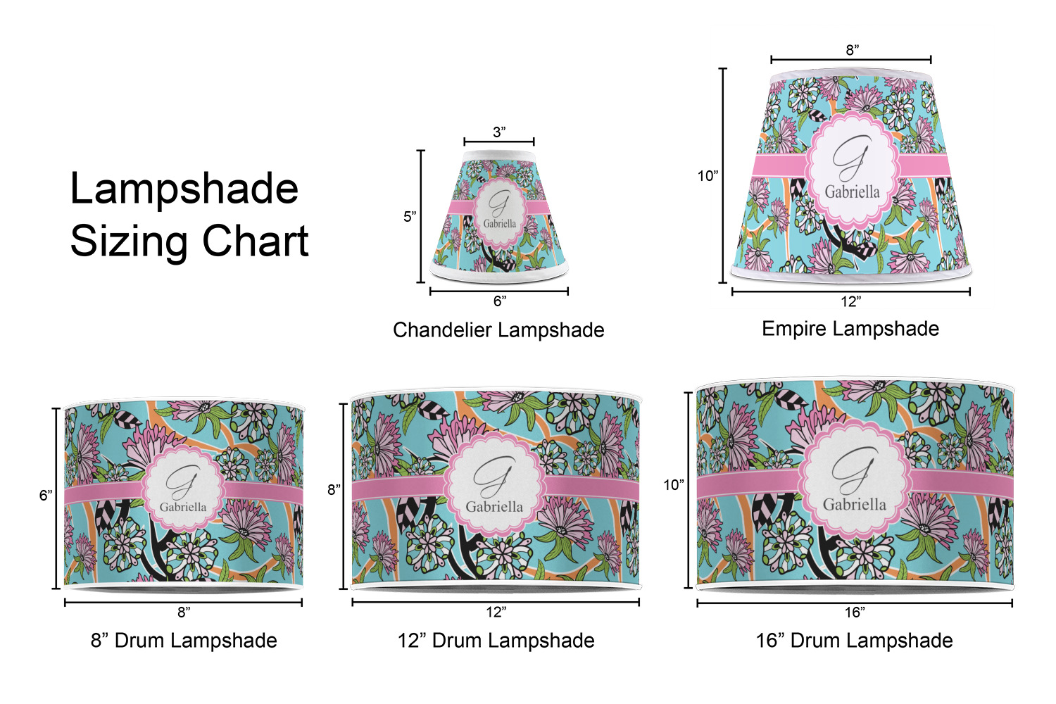 Our customized lamp shades also come in 3 different sizes: 8", 12" and 16", measuring at 8" in diameter by 6" tall, 12" in diameter by 8" tall, and 16" in diameter by 10" tall, respectively.