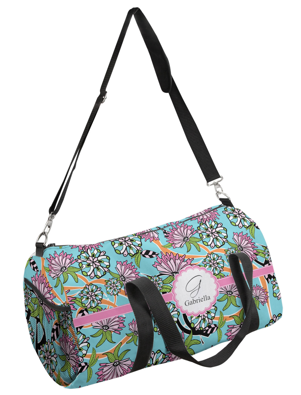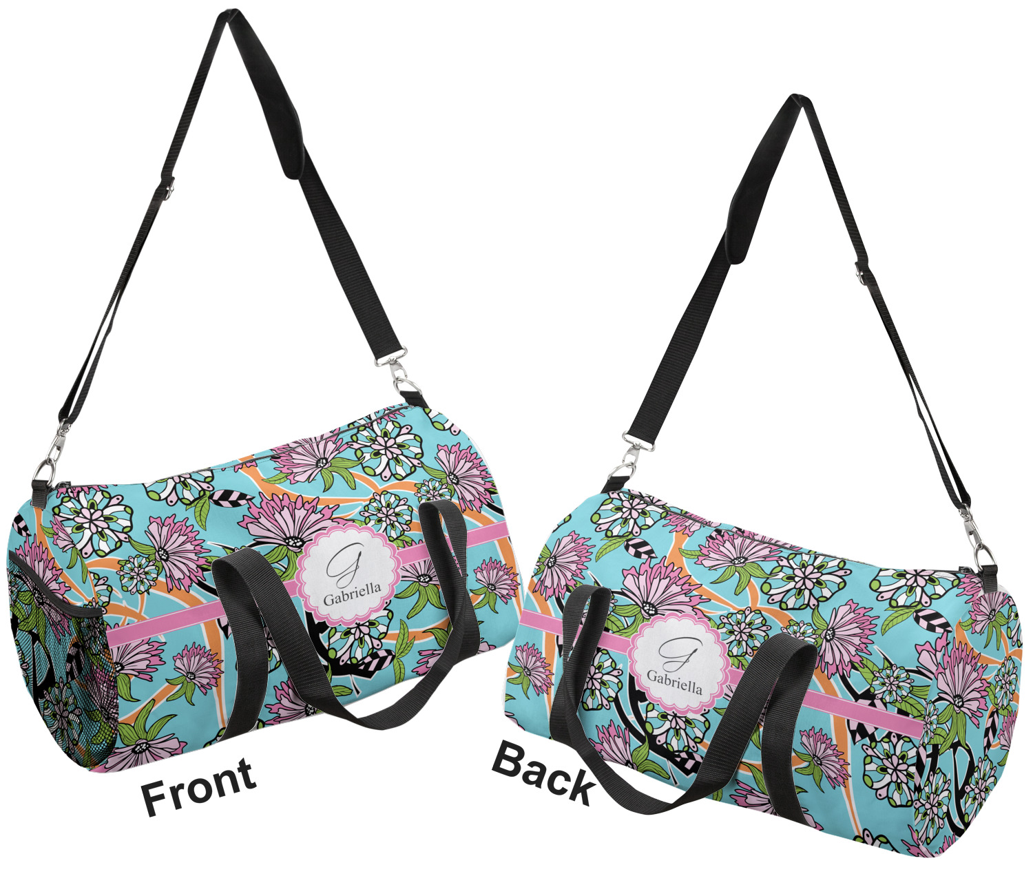 This duffle is a sturdy bag made of a canvas material. It comes in two sizes: Small (19"W x 9.5"H x 9.5"D) and Large (23"W x 12"H x 12"D). The bag is a cylindrical shape with a black adjustable strap and two handles. On one side is an elastic pouch to put a waterbottle or other small item. Your product will be sublimated with your design and is able to be designed on the front, back, and sides. Be sure to remember that the straps may cut into parts of your design if you upload your own artwork.