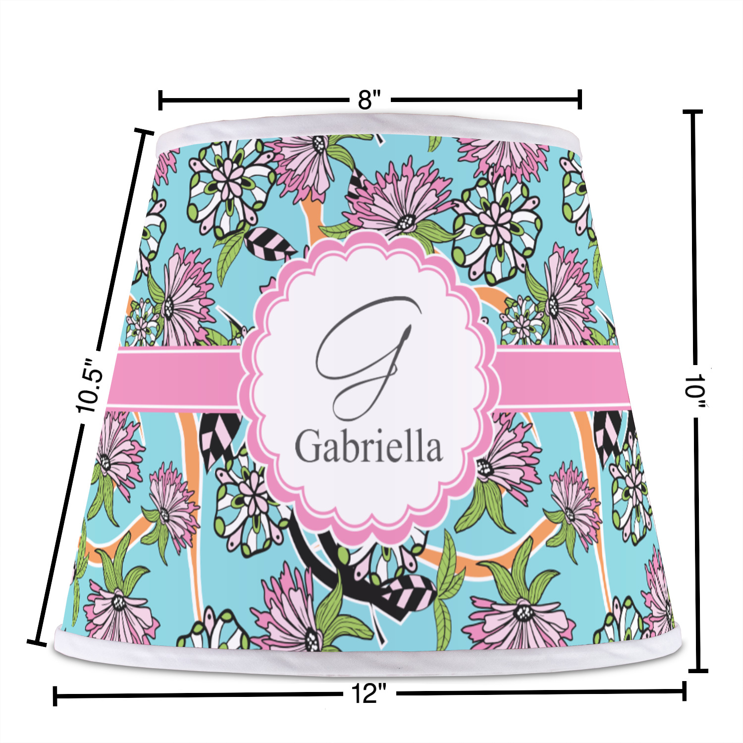 The base of this lampshade is 12 inches in diameter, and the top spans 8 inches in diameter. The total height of the lampshade is 10 inches. The angled nature of this custom lampshade concentrates the light, making it ideal for smaller spaces. This lampshade is made of matte, polyfilm, and displays your customization in its middle. The top and bottom of this colorful lamp shade are lined with a white fabric ribbon (which can be replaced with black inside the design studio) which frames your design and creates a sophisticated finish. As an UNO fitter lampshade, this unique lamp shade will fit a variety of bases.