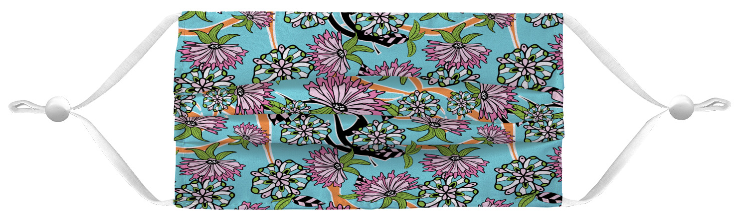 These fun face masks are 7" wide and 3.5" high. They feature pleats, adjustable ear loops, and are made with two layers of fabric. The top layer where your design is printed is a breathable polyester sheeting, while the inside layer is a soft microfiber polyester