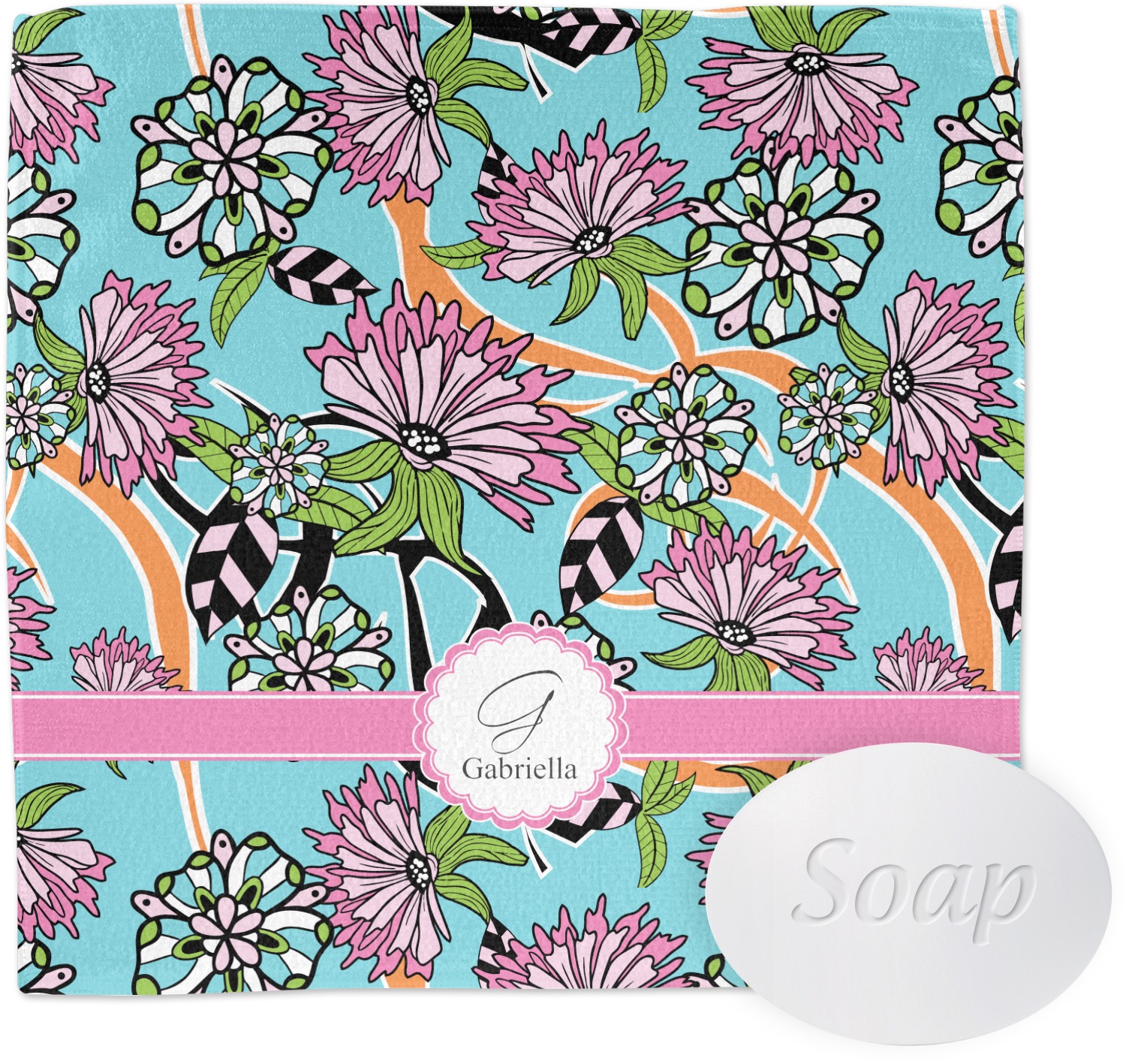 The flowers in this design are colored in two different shades of pink, lime green, and sky blue and are trimmed in black to make them pop out up against a sky blue background. The design has a classic ribbon in light pink trimmed in white. The decorative scalloped label is in white and trimmed in the light pink and white. Add an initial and a name for that personal touch to pull the entire design together.