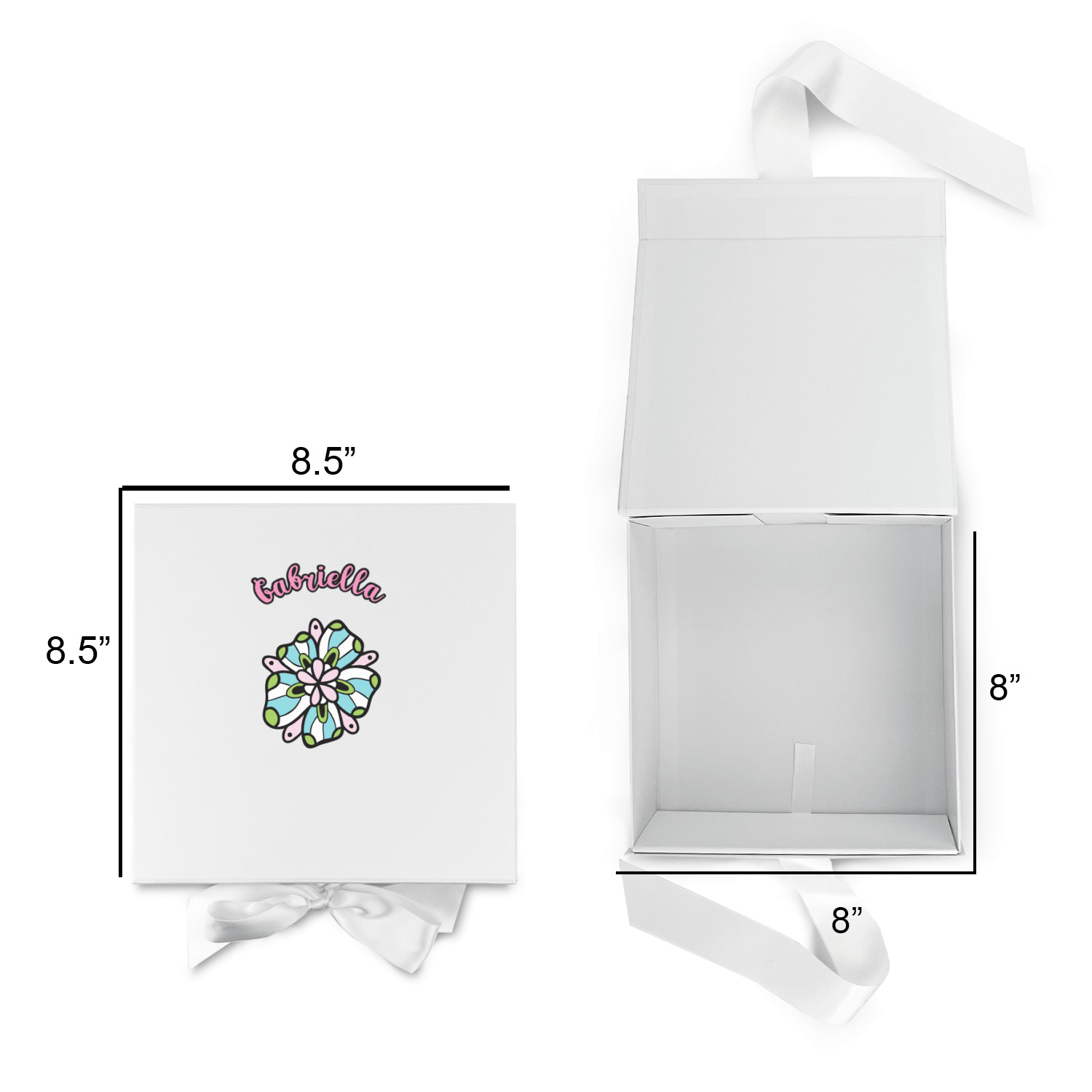 Design your own using our design library and we will print your artwork onto the lid of the gift box. When the box is closed the ribbons can be tied to secure the lid and add to the elegant look of these gift boxes.