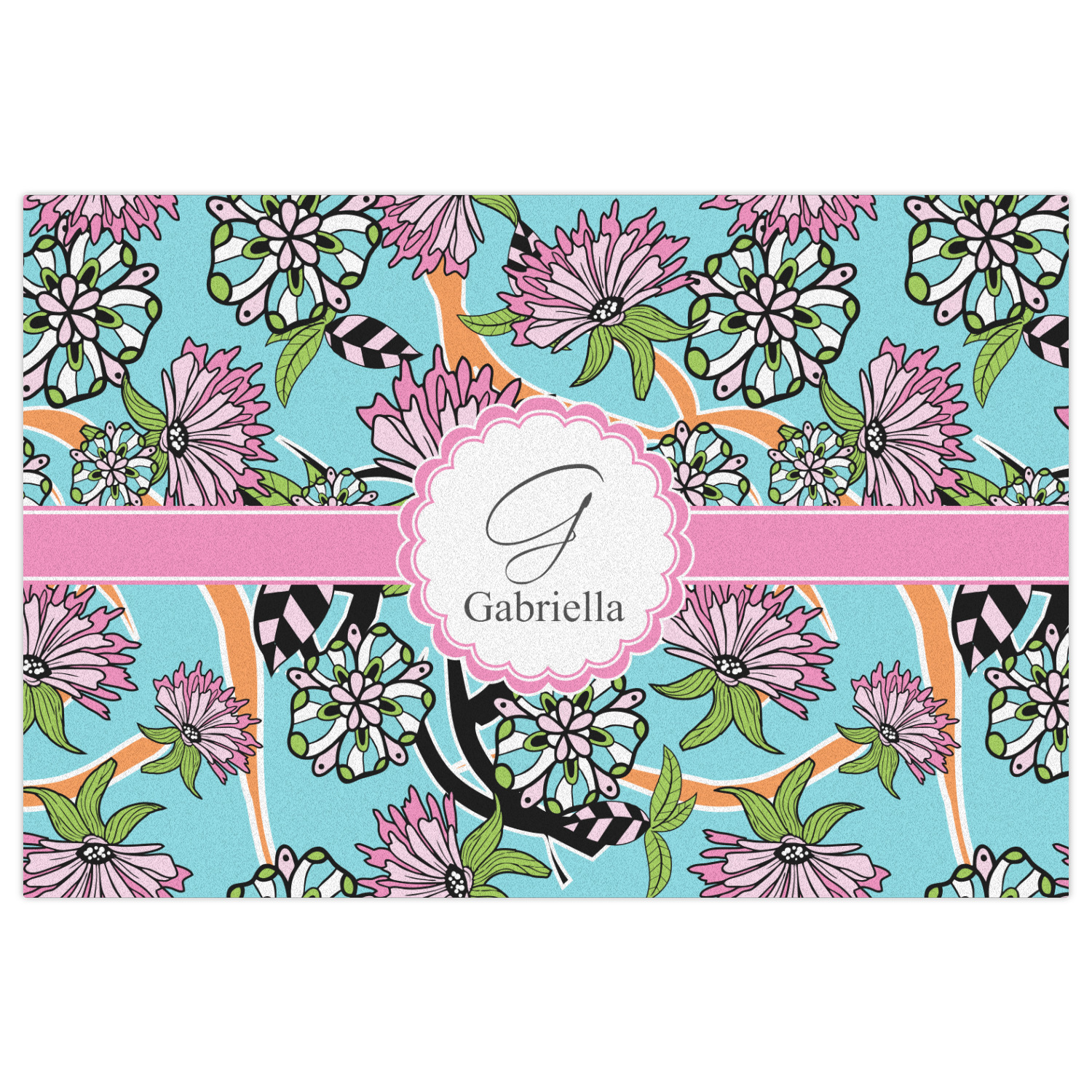 The flowers in this design are colored in two different shades of pink, lime green, and sky blue and are trimmed in black to make them pop out up against a sky blue background. The design has a classic ribbon in light pink trimmed in white. The decorative scalloped label is in white and trimmed in the light pink and white. Add an initial and a name for that personal touch to pull the entire design together.