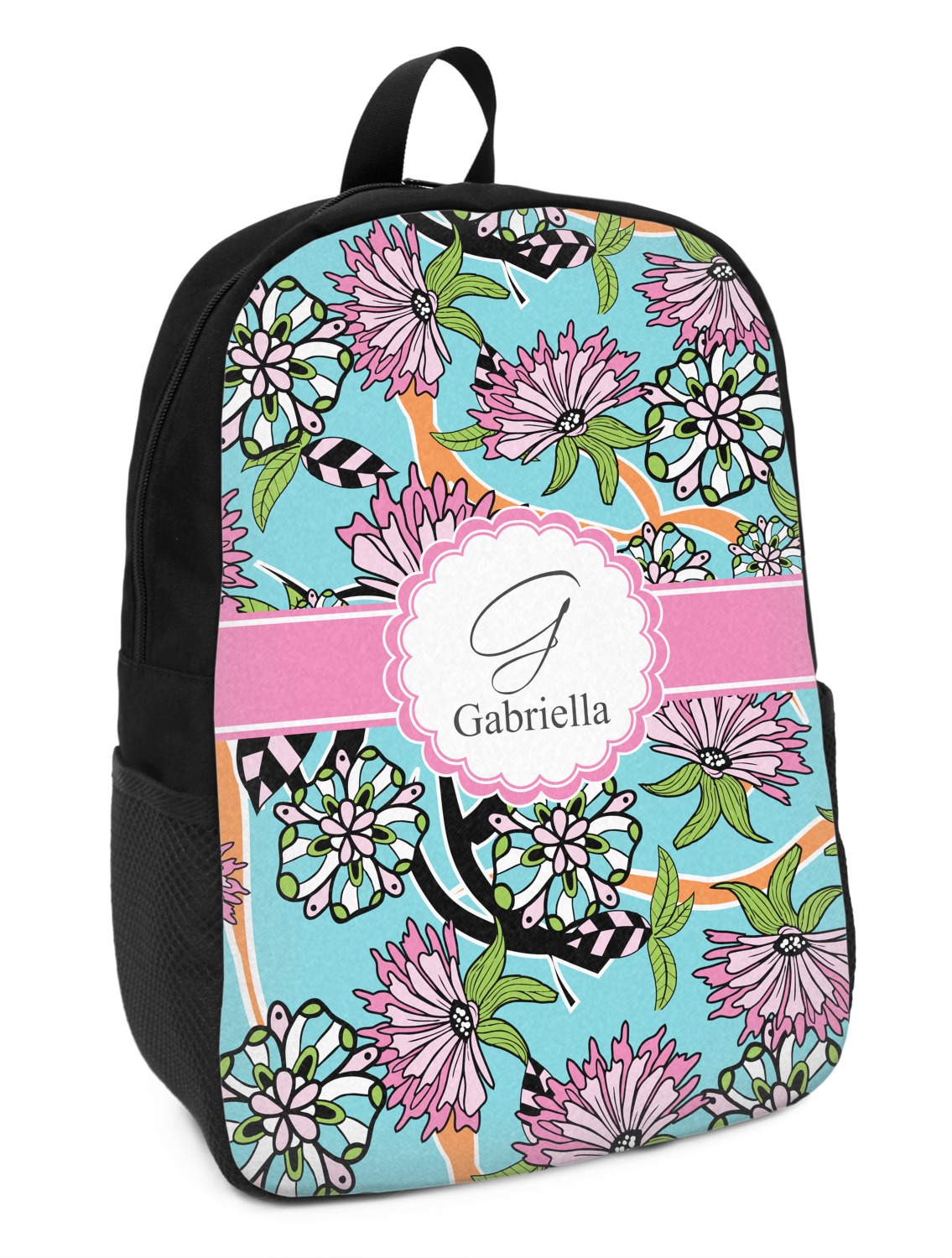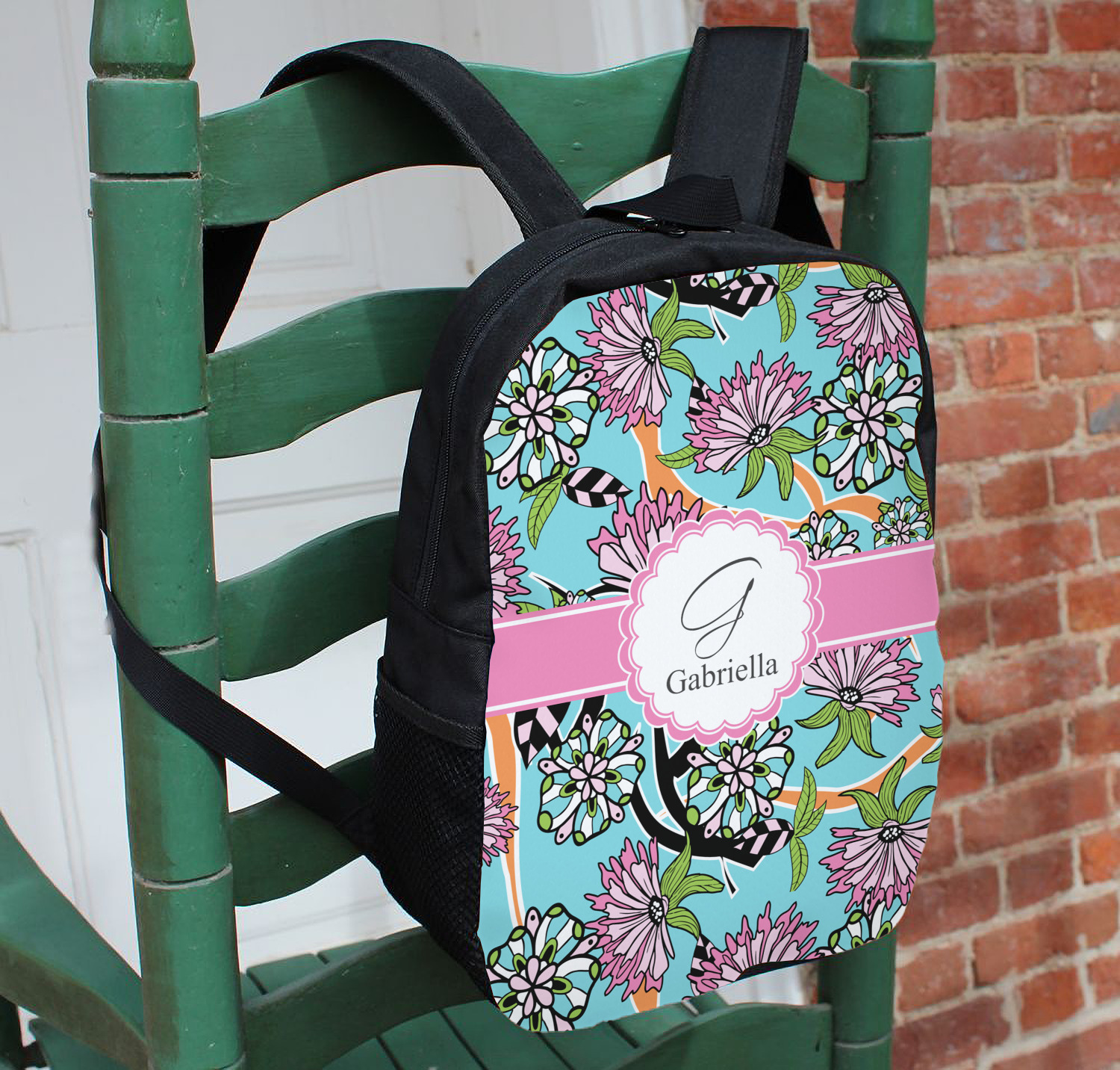 These small backpacks are made of a durable black canvas material with your personalization right on the front. The two shoulder straps are padded and easily adjustable. The bag itself measures at about 11" W x 15" H x 5" D. It's the perfect size for elementary aged kids or adults who want a smaller backpack. On the top of the bag you will find a handle to hang or carry your backpack by as well as a large zipper closure to keep all of your belongings safe inside. On each side of your backpack is a mesh pocket for a small item or water bottle. Inside your backpack you will find a spacious area with a small zipper pocket and a padded laptop slot that will fit up to a 13" laptop (13" being very snug). This is the perfect bag for any student that needs a couple books and their laptop with them at all times. It also works great as a carry on for traveling!