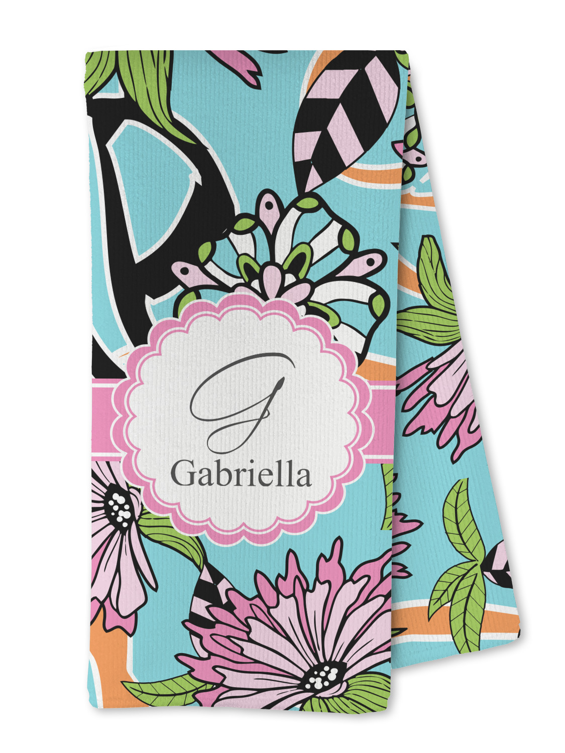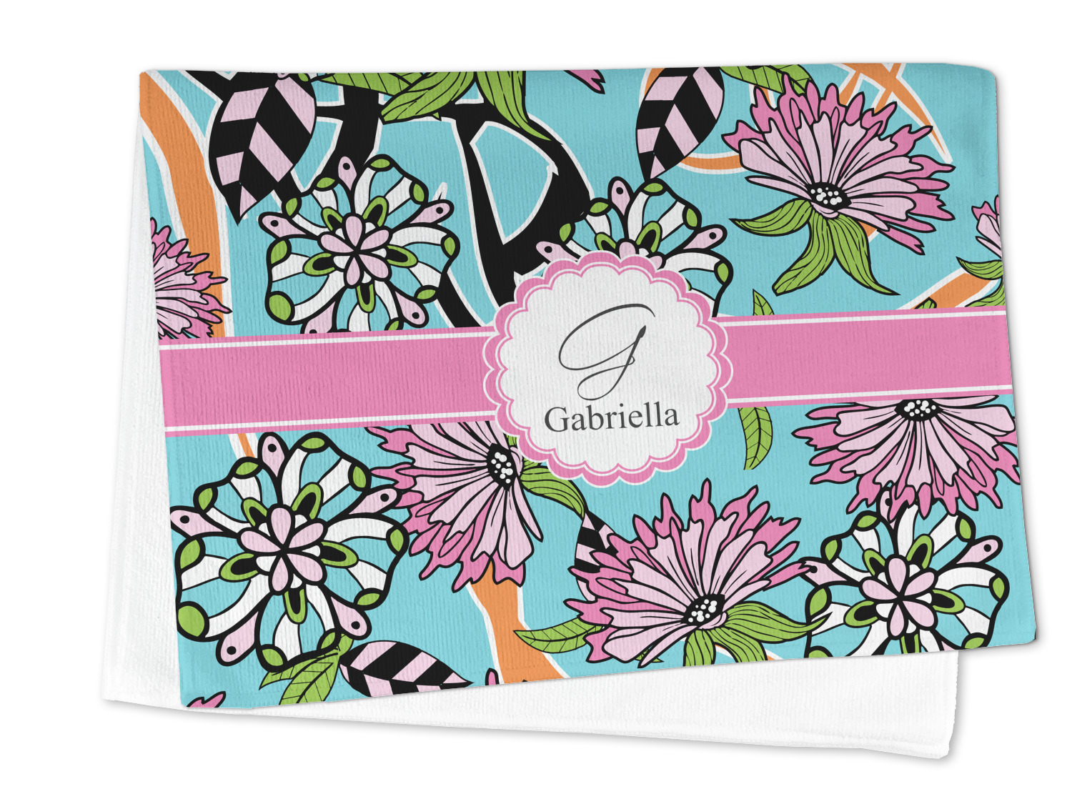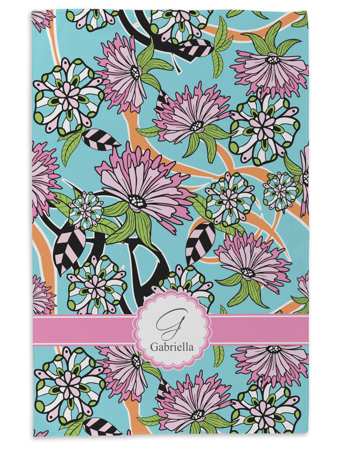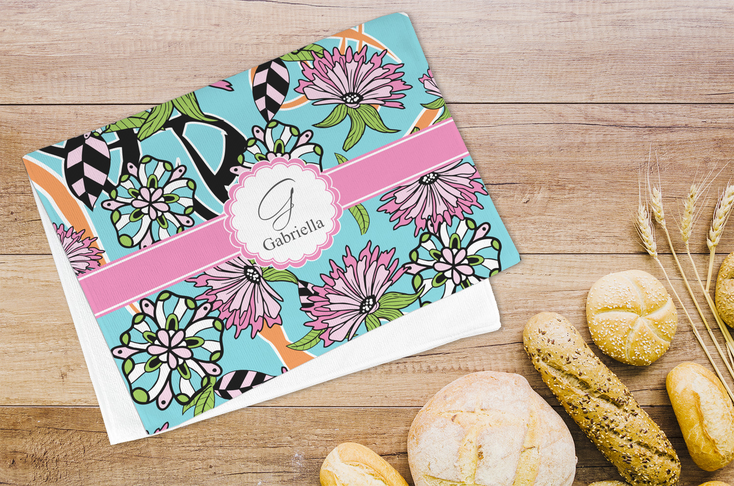 The flowers in this design are colored in two different shades of pink, lime green, and sky blue and are trimmed in black to make them pop out up against a sky blue background. The design has a classic ribbon in light pink trimmed in white. The decorative scalloped label is in white and trimmed in the light pink and white. Add an initial and a name for that personal touch to pull the entire design together.