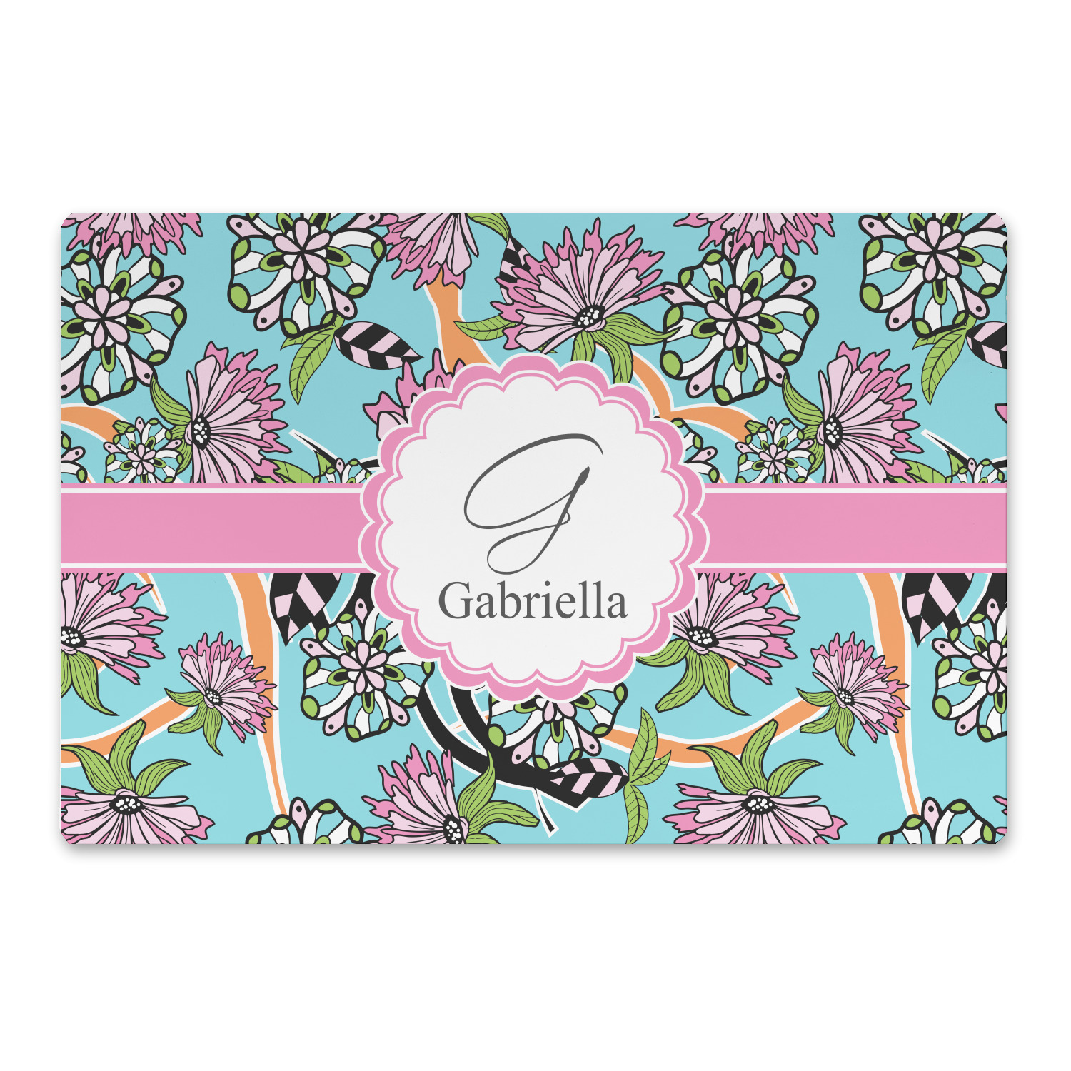 The flowers in this design are colored in two different shades of pink, lime green, and sky blue and are trimmed in black to make them pop out up against a sky blue background. The design has a classic ribbon in light pink trimmed in white. The decorative scalloped label is in white and trimmed in the light pink and white. Add an initial and a name for that personal touch to pull the entire design together.