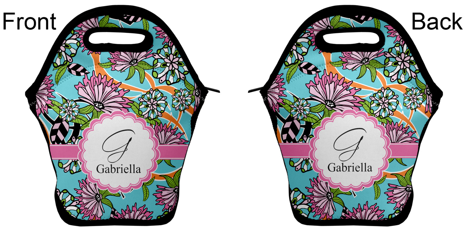 Our personalized lunch bags are made from a strong neoprene, and secure with a zipper closure that lines the top of the bag.The edges of the neoprene are sewn together with a heavy duty stitch, adding to the durability of the bag. The is accompanied by a reinforced handle at its top, for the easy transport of your lunch. We display your personalization across both the front and back of this neoprene lunch bag, while the remaining sides are a sleek black in color. Each bag measures at 13.5 inches tall, and 11.5 inches wide.
