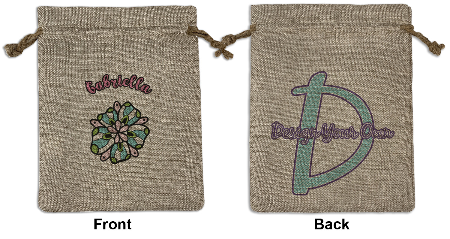 We sell our Burlap Gift Bags in 3 variant sized bags. Made with burlap polyester, each personalized bag can be secured with a twine drawstring pull. Your custom design is available to print on one side or both sides - completely up to you! The sizes of the bags measure approximately 4.5" x 6.5" for the smallest size, 6.5" x 8.0" for the medium size, and 6.5" x 13.5" for the large-sized bag.