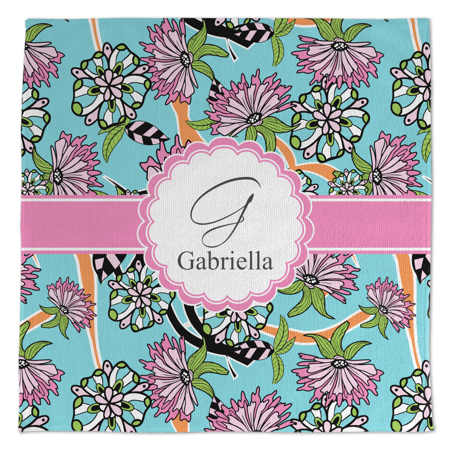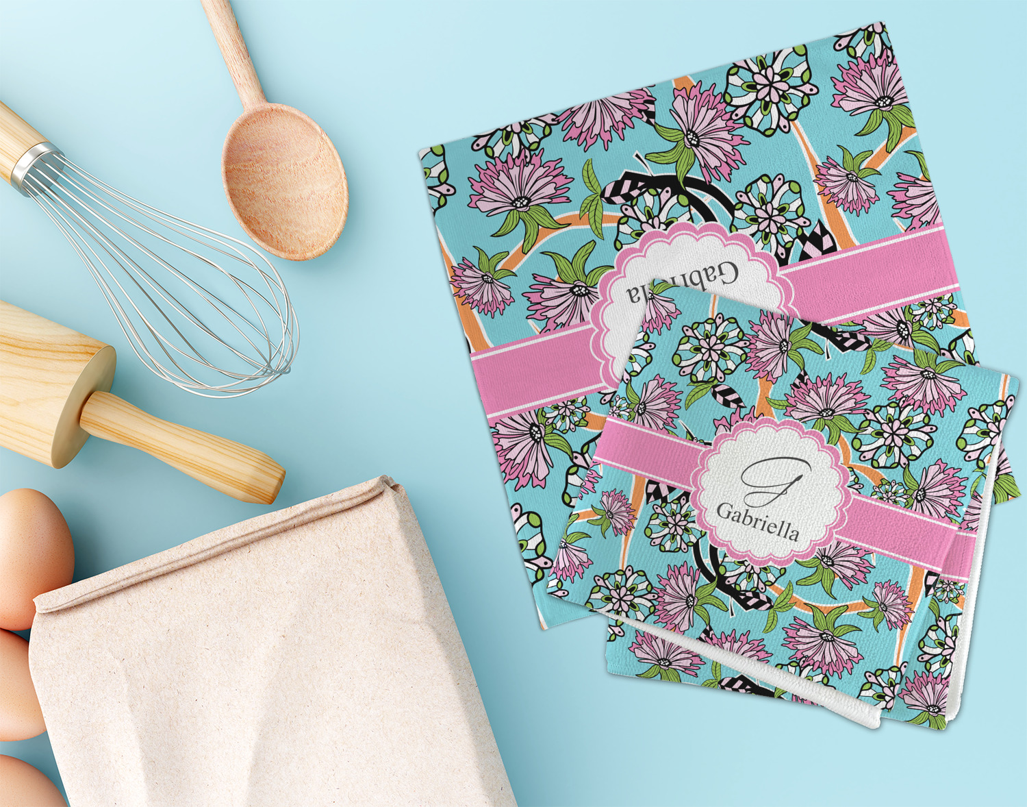 The flowers in this design are colored in two different shades of pink, lime green, and sky blue and are trimmed in black to make them pop out up against a sky blue background. The design has a classic ribbon in light pink trimmed in white. The decorative scalloped label is in white and trimmed in the light pink and white. Add an initial and a name for that personal touch to pull the entire design together.