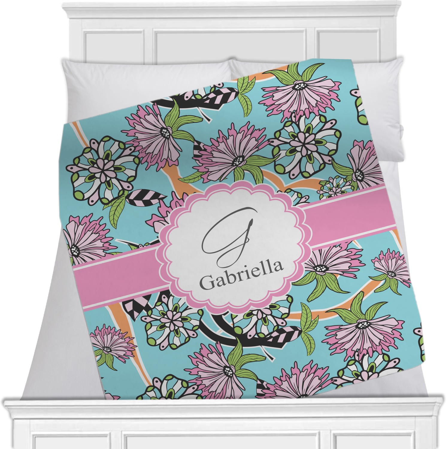 The flowers in this design are colored in two different shades of pink, lime green, and sky blue and are trimmed in black to make them pop out up against a sky blue background. The design has a classic ribbon in light pink trimmed in white. The decorative scalloped label is in white and trimmed in the light pink and white. Add an initial and a name for that personal touch to pull the entire design together.