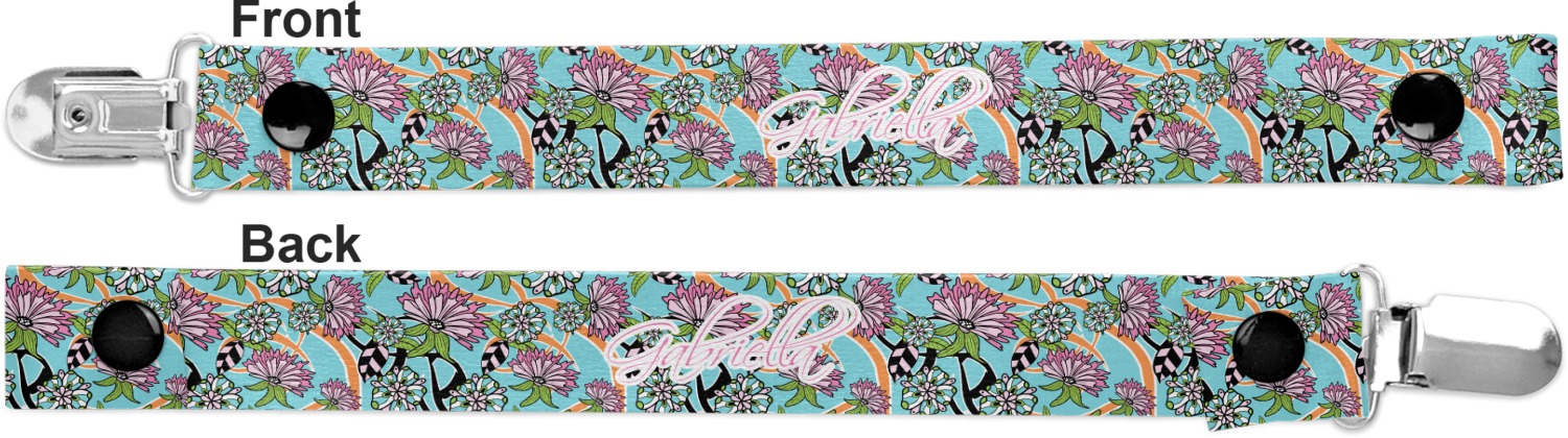 This personalized pacifier clip is the ideal size and measures at approximately 7.5 inches in length, when either end is snapped closed. On one end, you'll find a snap button. This button of your baby's pacifier holder is what can be attached to their pacifier to hold is securely in place. Simply open the snap, slip it through the pacifier opening, and snap it back into place. On the opposite end of this baby pacifier holder, you'll find a metal clip that can secure to a baby's collar or sleeve. This clip ensures that the strap stays in place, and that your baby's pacifier is always on hand.