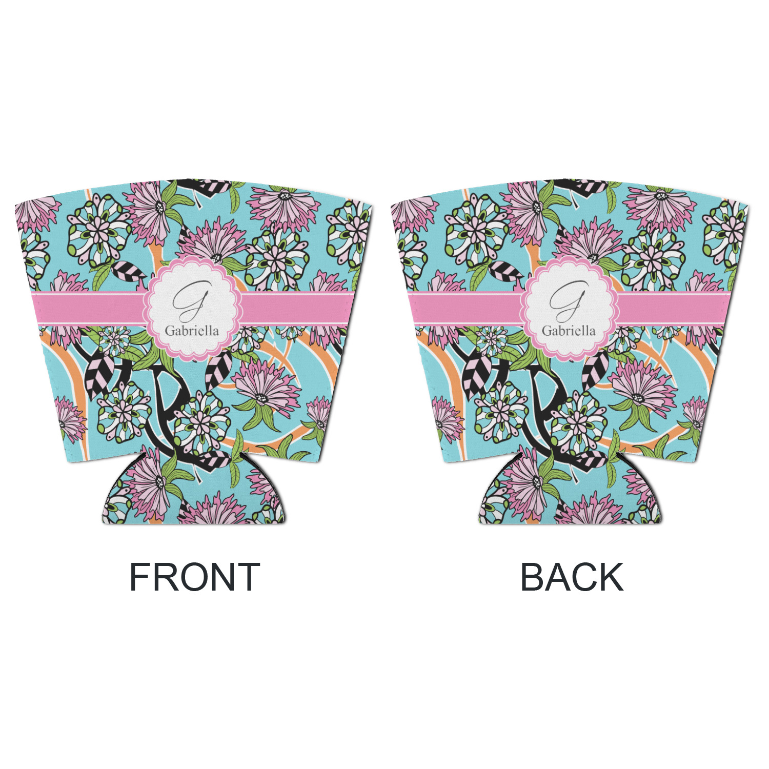 The flowers in this design are colored in two different shades of pink, lime green, and sky blue and are trimmed in black to make them pop out up against a sky blue background. The design has a classic ribbon in light pink trimmed in white. The decorative scalloped label is in white and trimmed in the light pink and white. Add an initial and a name for that personal touch to pull the entire design together.