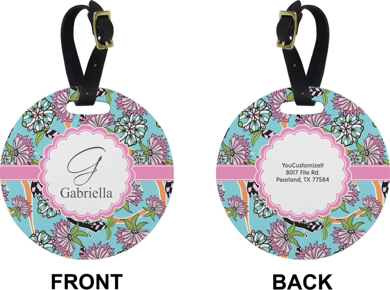 These personalized bag tags are sold in a variety of shapes, so that you may find the product that meets your vision exactly. We sell a round luggage tag, which measures at approximately 4" x 4". Our square luggage tag is about 3.5" x 3.5", while our rectangular version is 2.75" x 4 ".