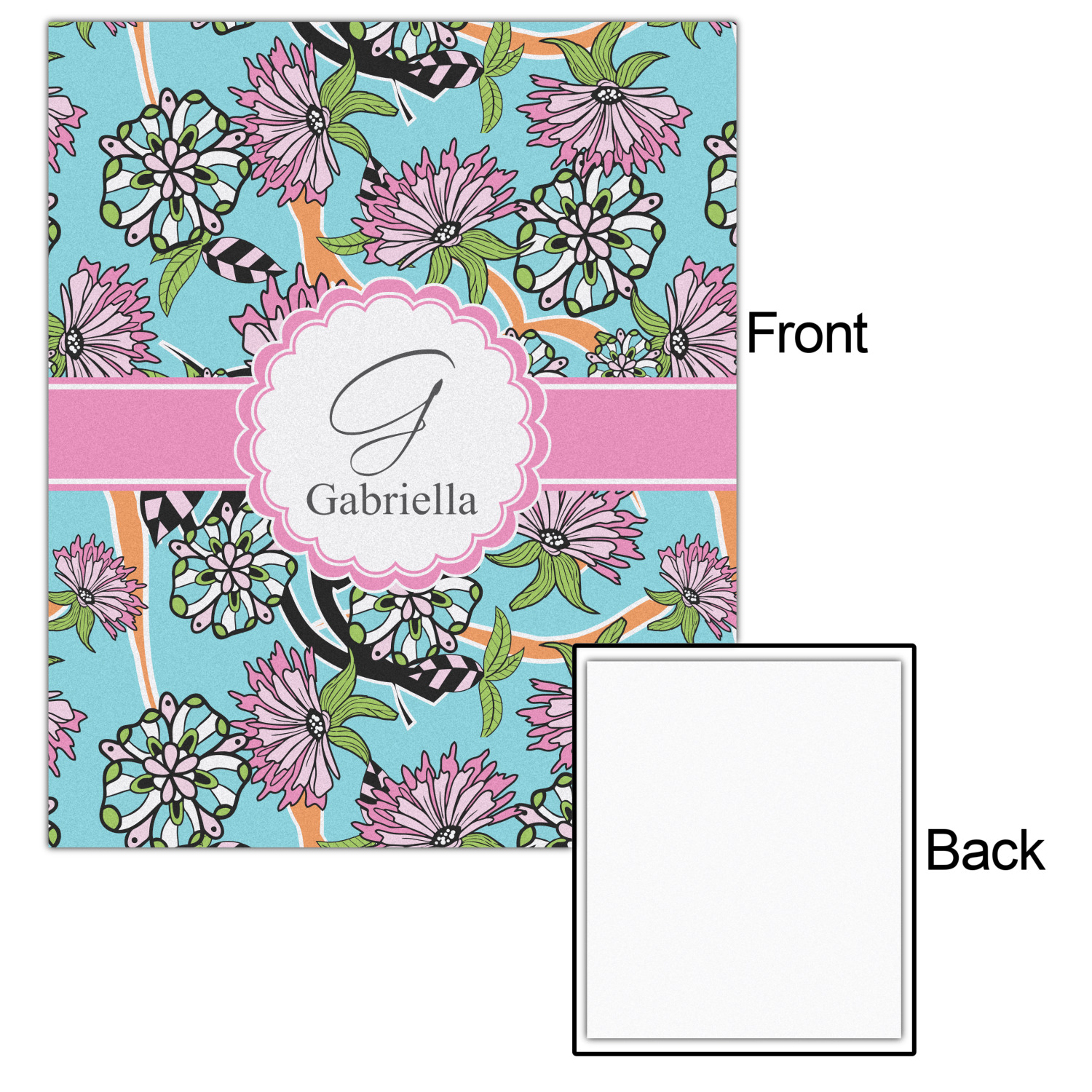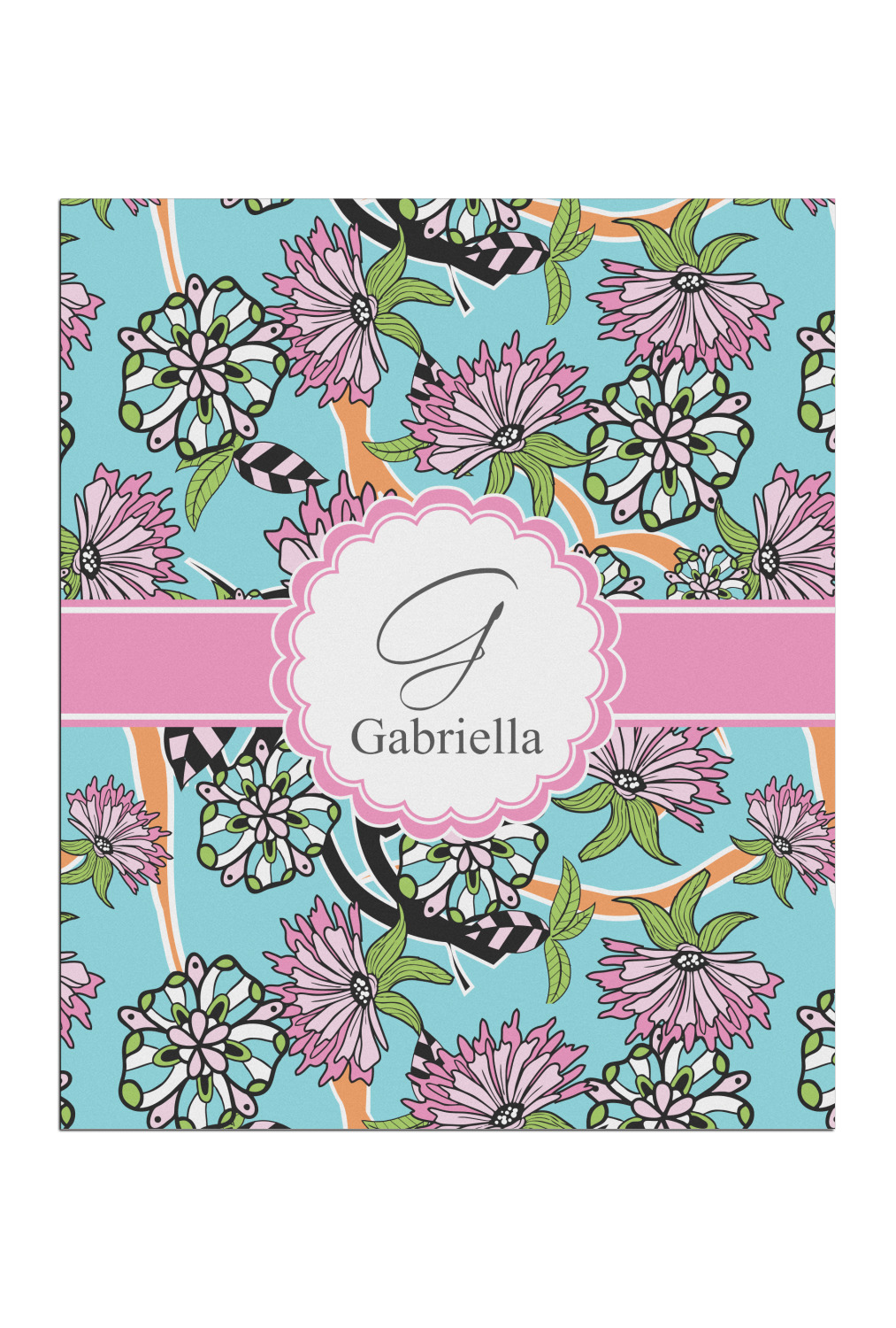 The flowers in this design are colored in two different shades of pink, lime green, and sky blue and are trimmed in black to make them pop out up against a sky blue background. The design has a classic ribbon in light pink trimmed in white. The decorative scalloped label is in white and trimmed in the light pink and white. Add an initial and a name for that personal touch to pull the entire design together.