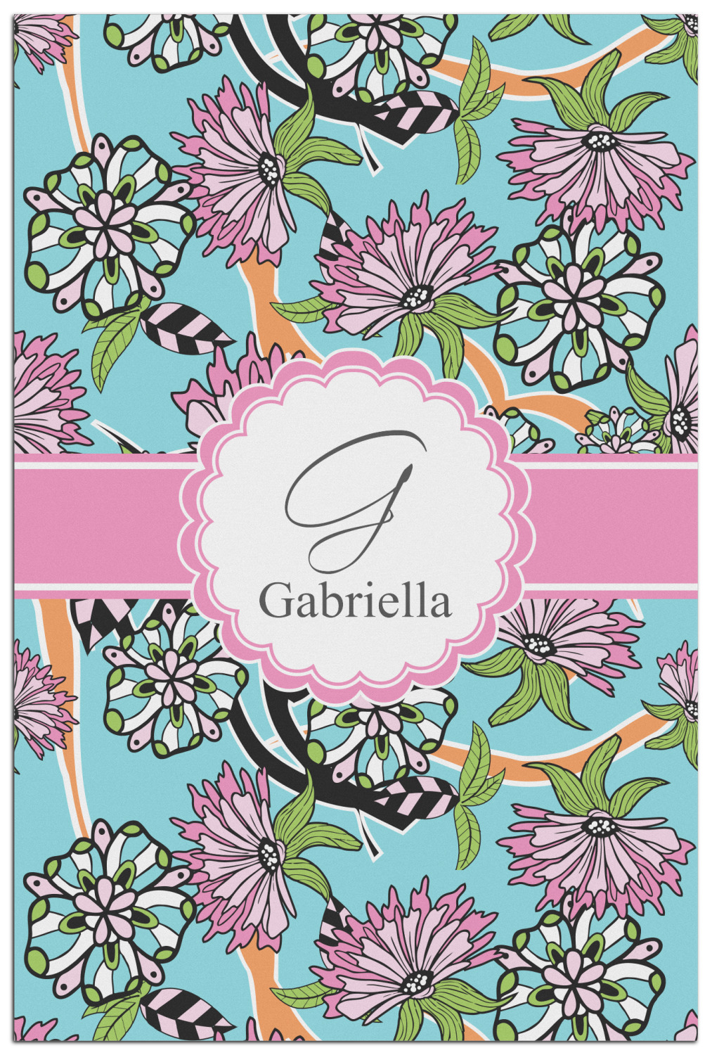 The flowers in this design are colored in two different shades of pink, lime green, and sky blue and are trimmed in black to make them pop out up against a sky blue background. The design has a classic ribbon in light pink trimmed in white. The decorative scalloped label is in white and trimmed in the light pink and white. Add an initial and a name for that personal touch to pull the entire design together.