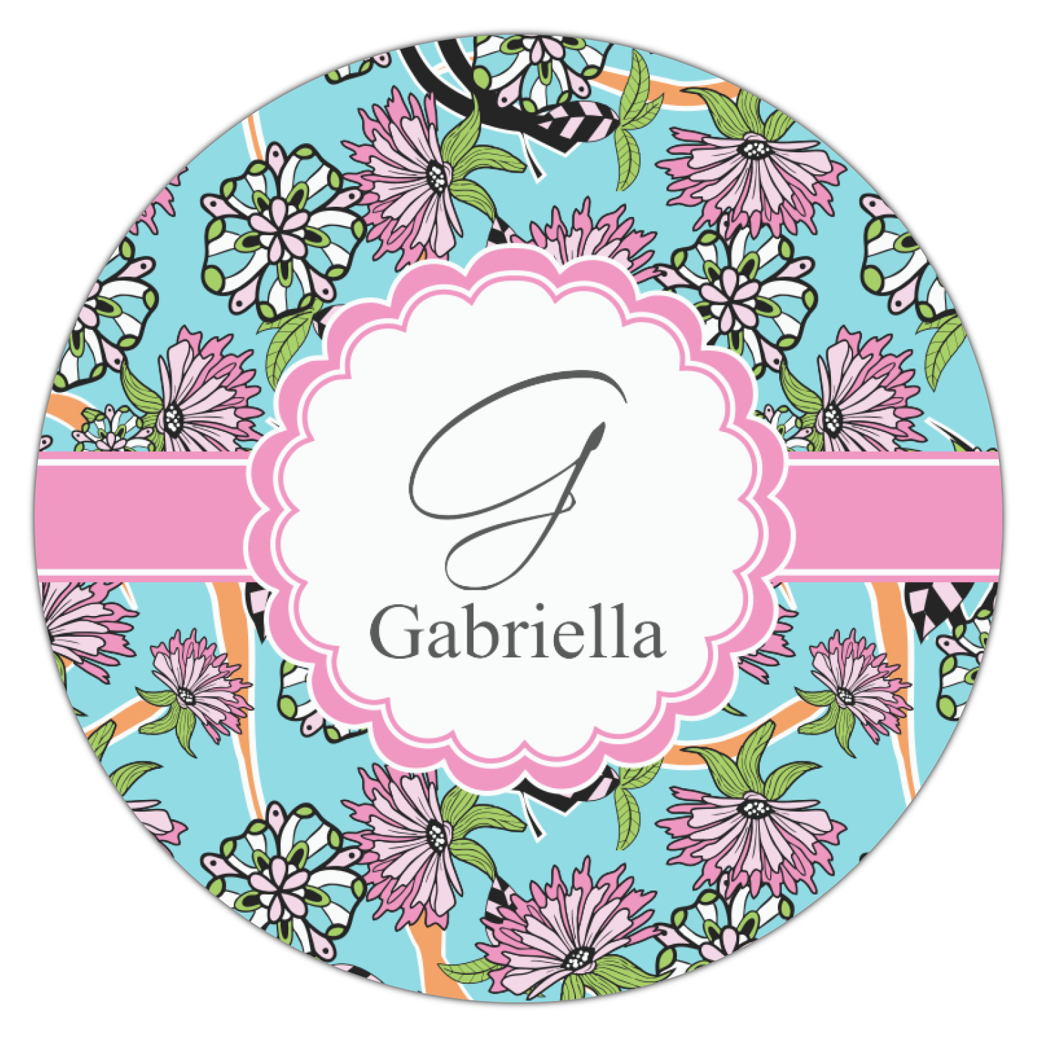 The flowers in this design are colored in two different shades of pink, lime green, and sky blue and are trimmed in black to make them pop out up against a sky blue background. The design has a classic ribbon in light pink trimmed in white. The decorative scalloped label is in white and trimmed in the light pink and white. Add an initial and a name for that personal touch to pull the entire design together.