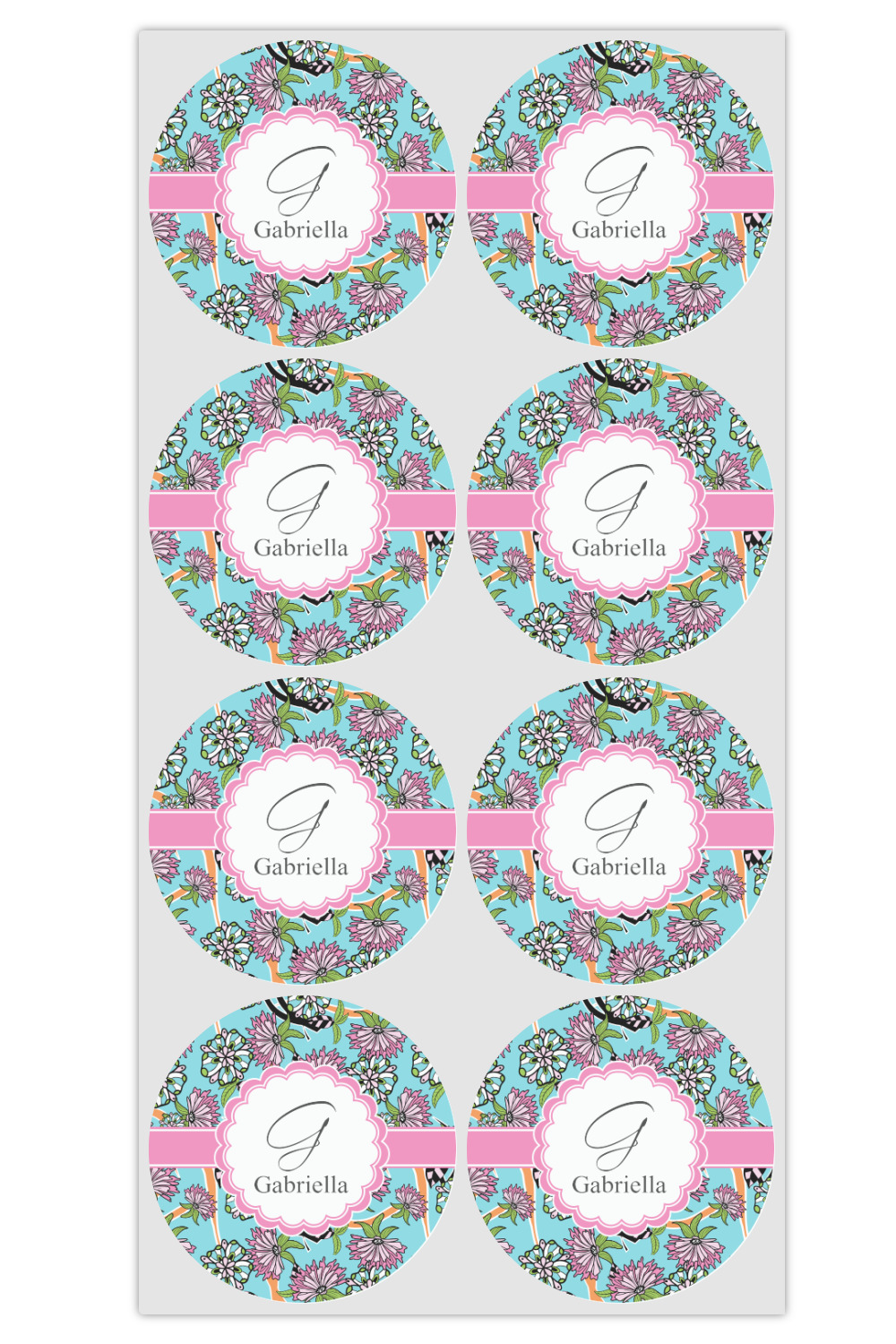 The flowers in this design are colored in two different shades of pink, lime green, and sky blue and are trimmed in black to make them pop out up against a sky blue background. The design has a classic ribbon in light pink trimmed in white. The decorative scalloped label is in white and trimmed in the light pink and white. Add an initial and a name for that personal touch to pull the entire design together.