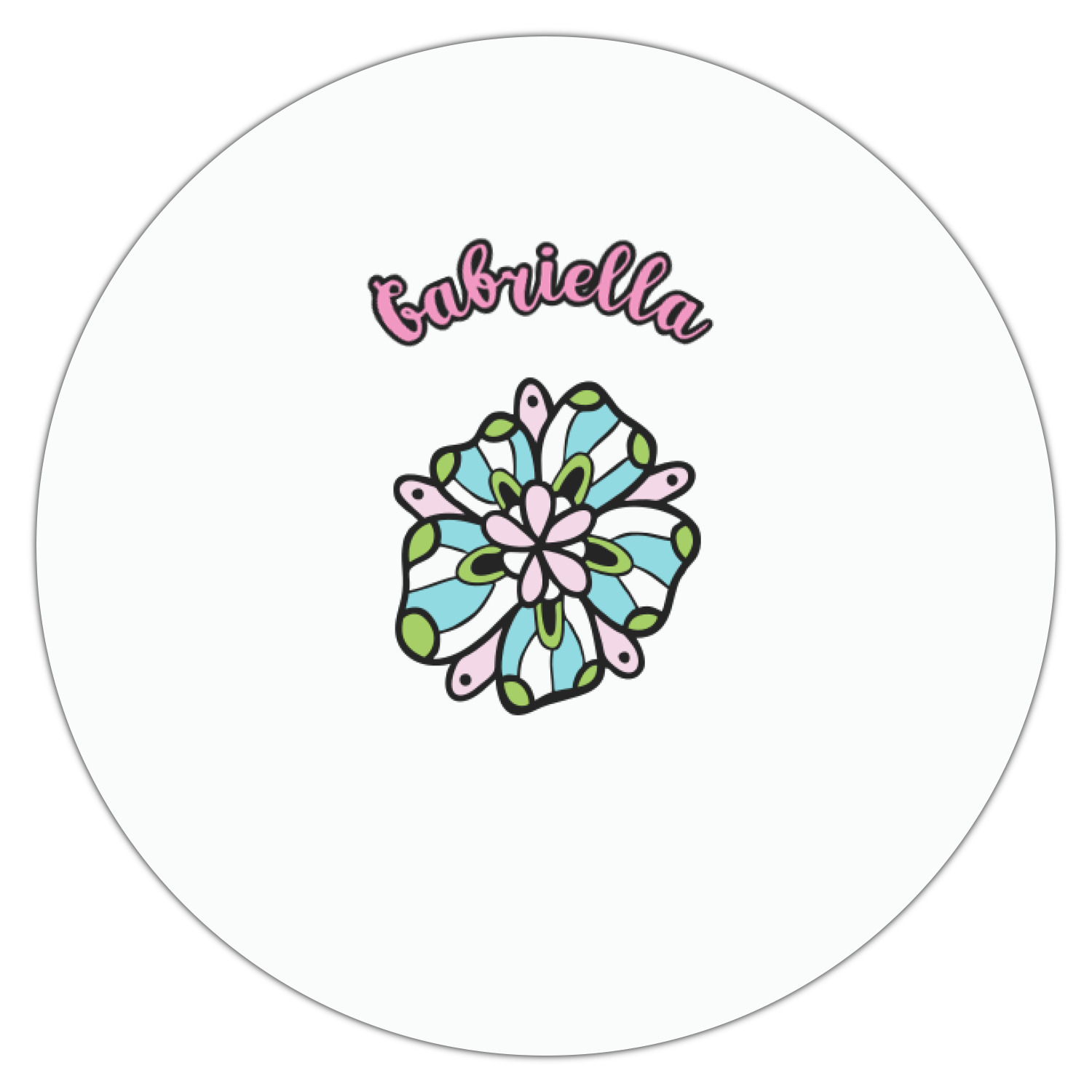 The flowers in this design are colored in two different shades of pink, lime green, and sky blue and are trimmed in black to make them pop out up against a sky blue background. The design has a classic ribbon in light pink trimmed in white. The decorative scalloped label is in white and trimmed in the light pink and white. Add an initial and a name for that personal touch to pull the entire design together.