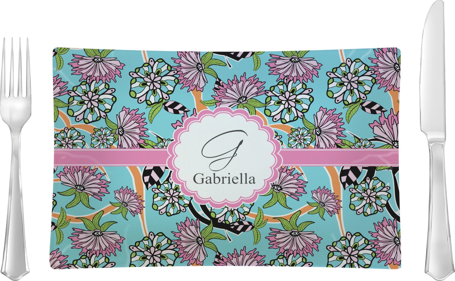 The flowers in this design are colored in two different shades of pink, lime green, and sky blue and are trimmed in black to make them pop out up against a sky blue background. The design has a classic ribbon in light pink trimmed in white. The decorative scalloped label is in white and trimmed in the light pink and white. Add an initial and a name for that personal touch to pull the entire design together.