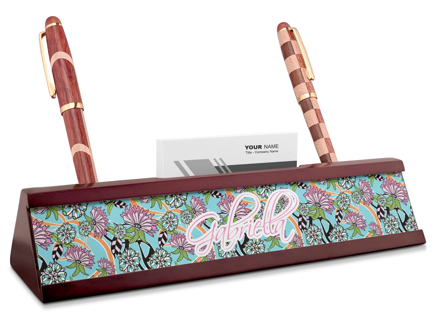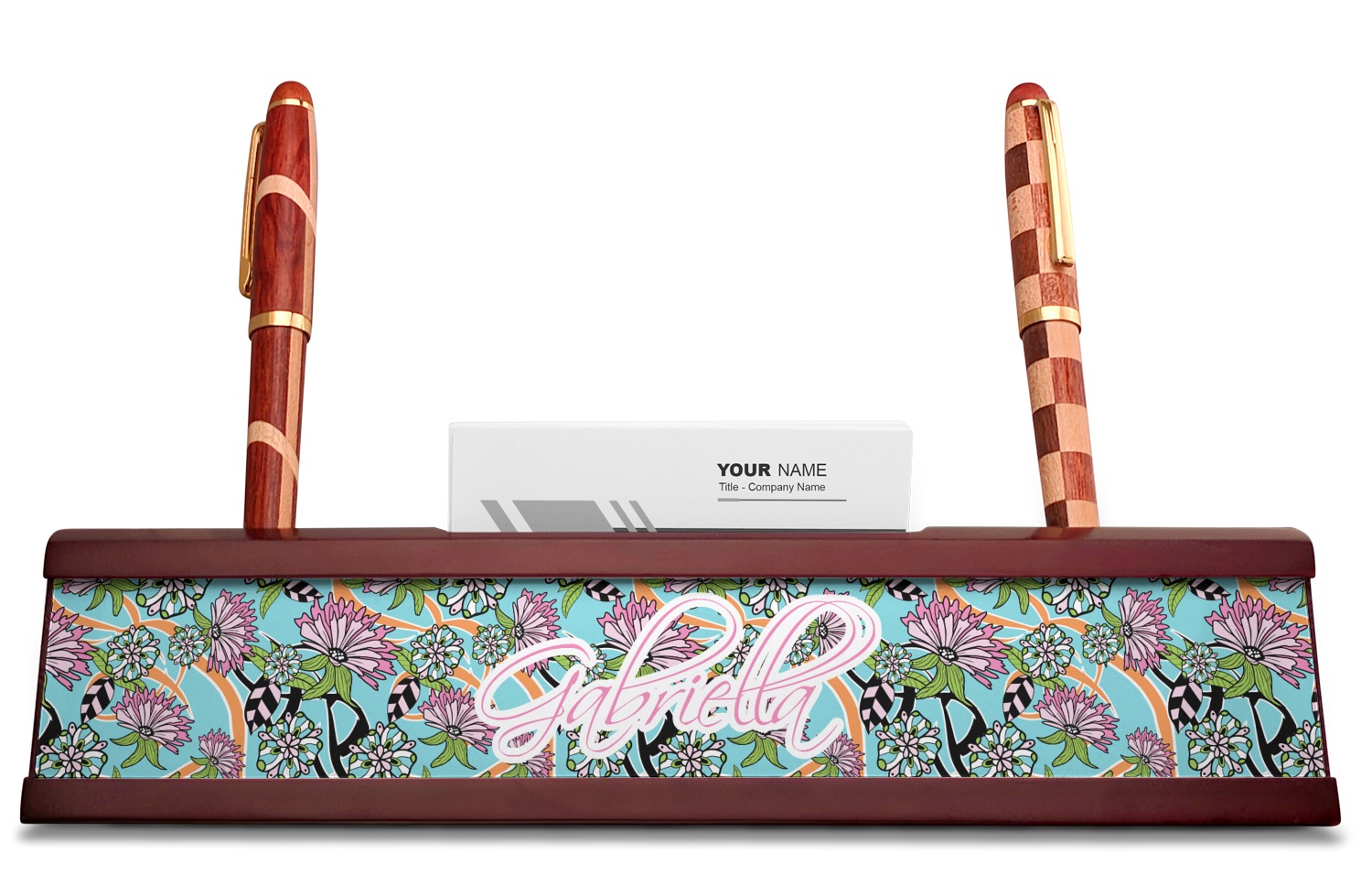 Your desk name plates are crafted from a high-quality, dark-cherry mahogany. At approximately 9.5 by 1.875 by 2.5 inches, this name plaque will fit perfectly, front and center, on your desk. Your customization spans across the entire face of the nameplate. Behind the nameplate lies a skinny slot that can fit approximately 15, traditionally-sized, business cards. You can also store your writing utensils on either side of this custom desk name plate.
